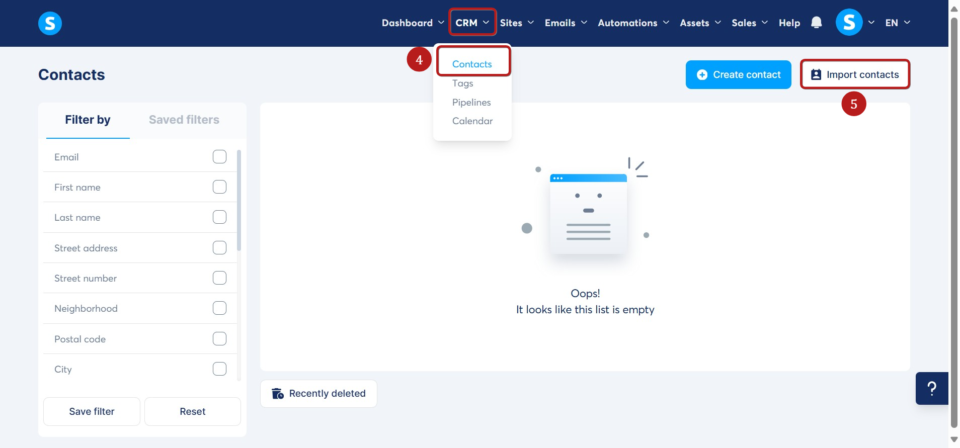CRM sekmesinde Kişiler'e (4) gidin, ardından Kişileri içe aktar'a (5) tıklayın.