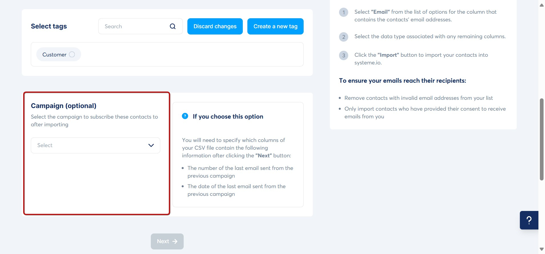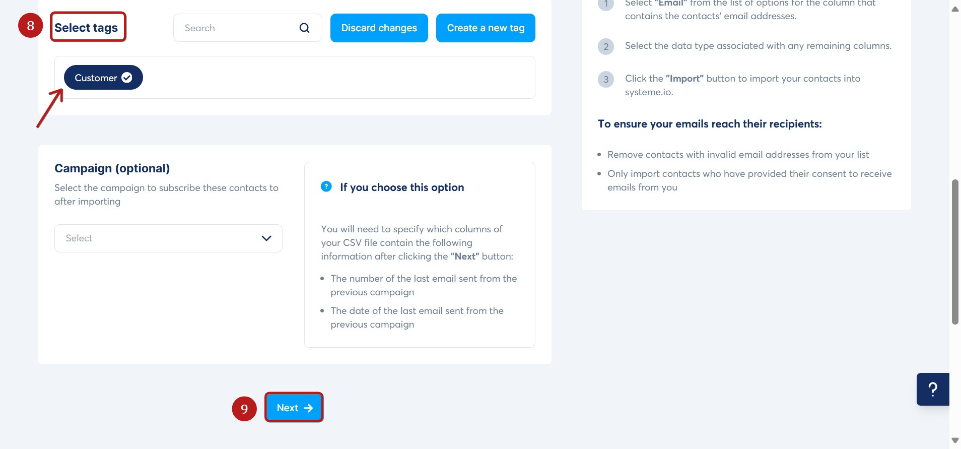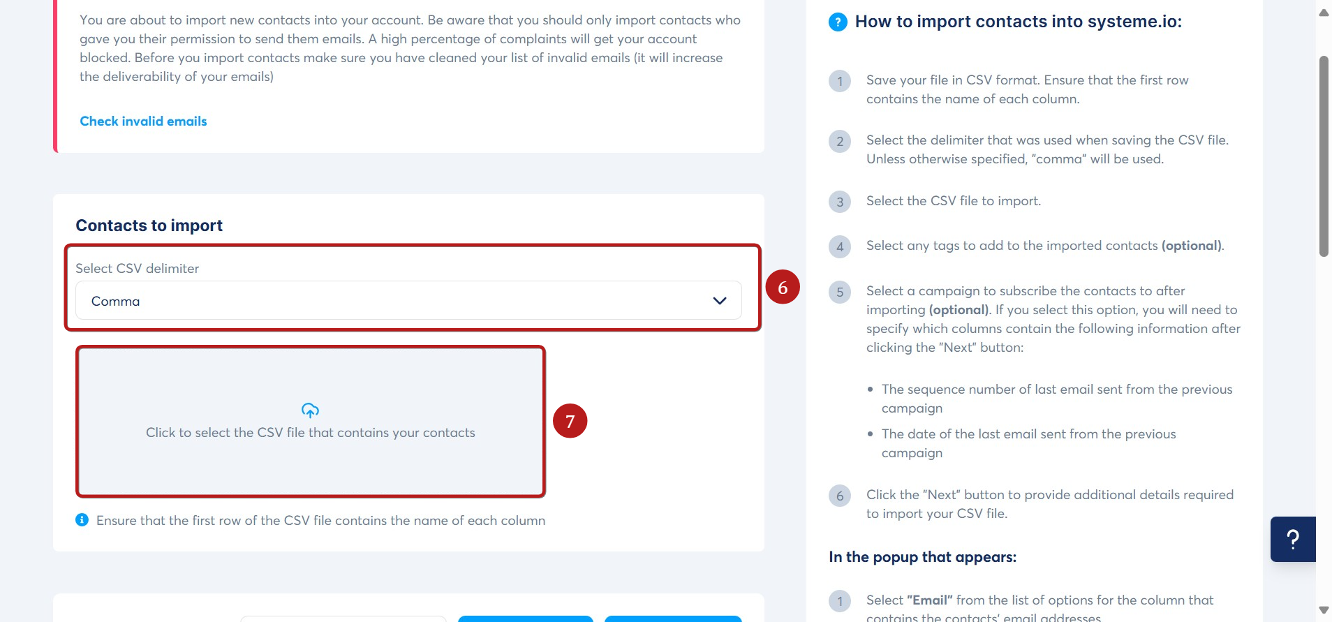 CSV dosyanızda kullanılan ayırıcıyı belirtmek için CSV ayırıcısını seç'e (6) gidin (Virgül, noktalı virgül veya dikey çizgi) ve dosyanızı yüklemek için şu etiketli kutuyu işaretleyin: Kişilerinizi içeren CSV dosyasını seçmek için tıklayın (7).