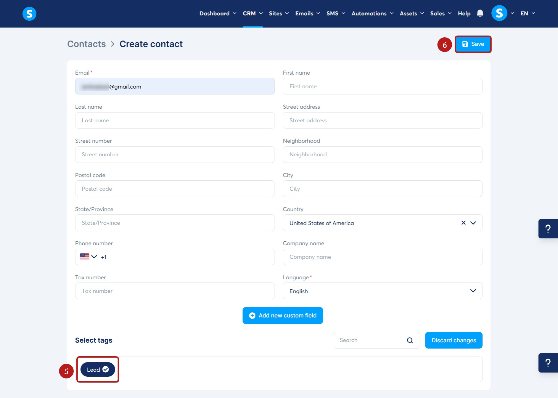 Kişiyi eklerken bir etiket atayabilirsiniz (5), ardından Kaydet'e (6) tıklayın.
