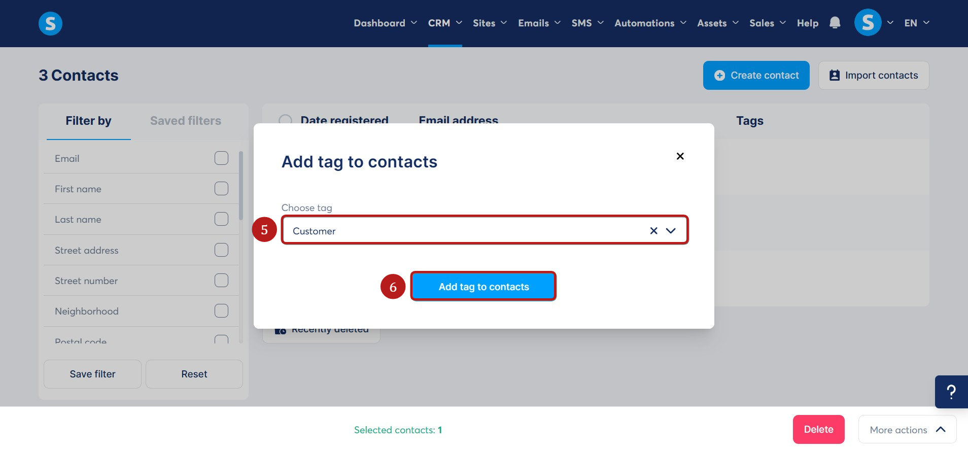 Kişinize atamak istediğiniz etiketi seçin (5) ve Kişilere etiket ekle ye tıklayın (6).