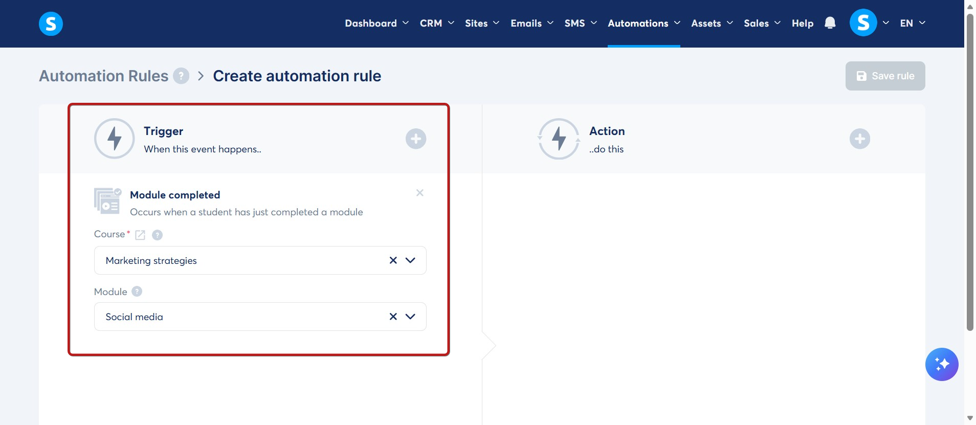 - Kuralınız için bir kurs ve bir modül seçtiğinizde: seçilen kursun belirli bir modülü tamamlandığında eylem tetiklenecektir.