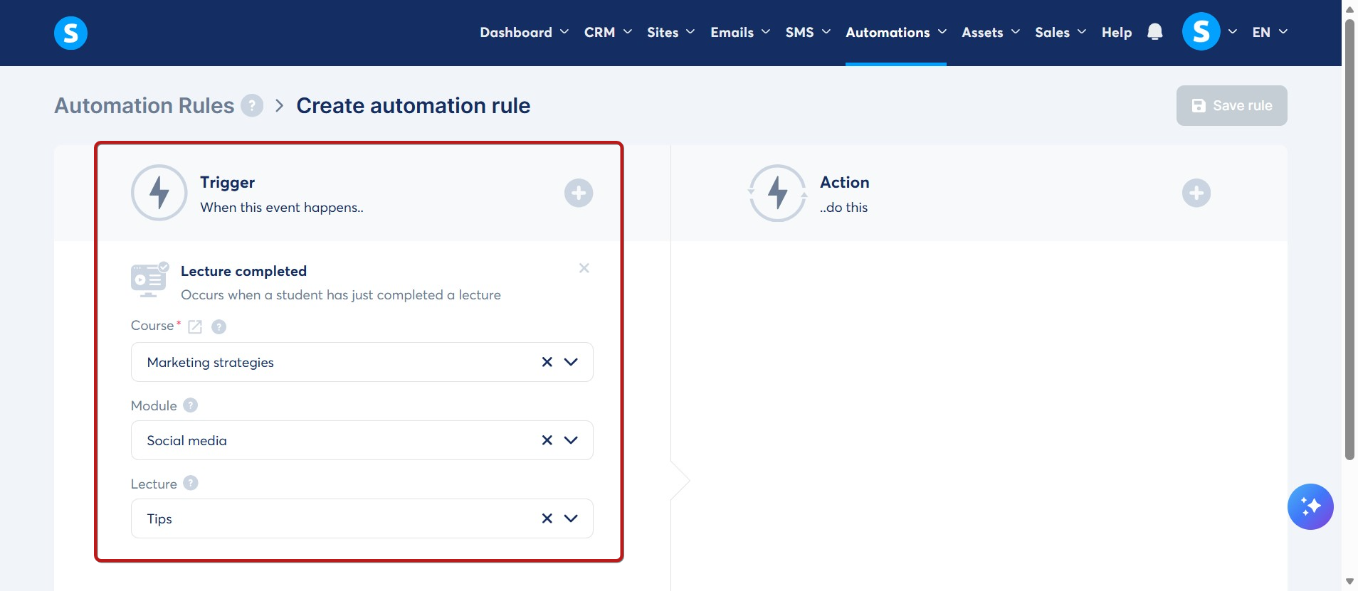 - Kuralınız için bir kurs, bir modül ve bir ders seçtiğinizde: ders tamamlandığında eylem tetiklenecektir.