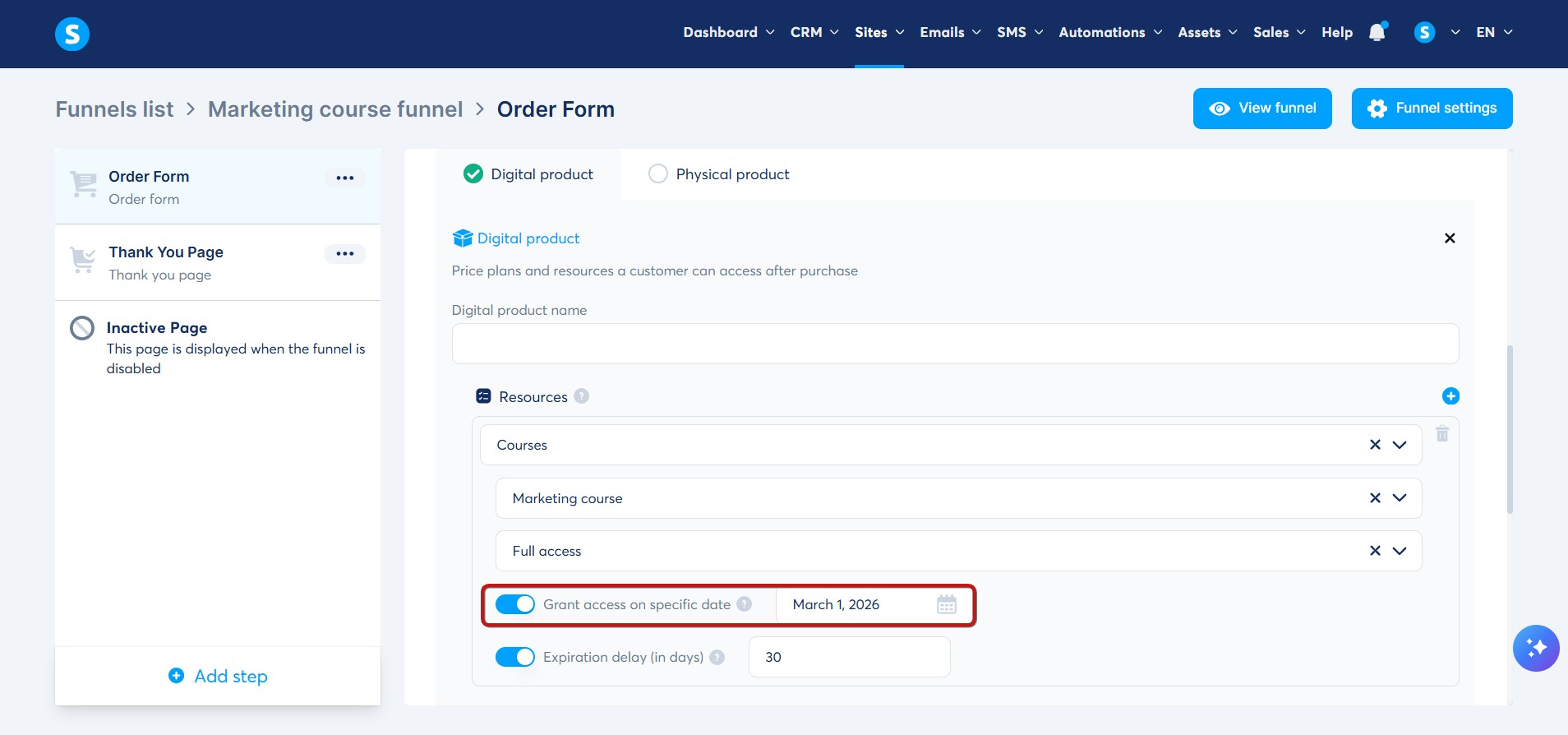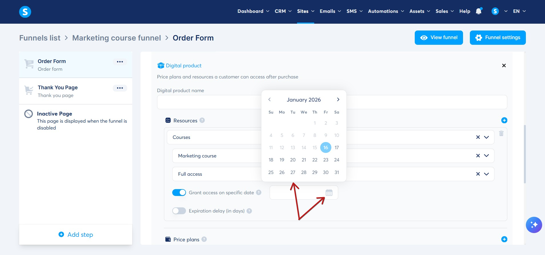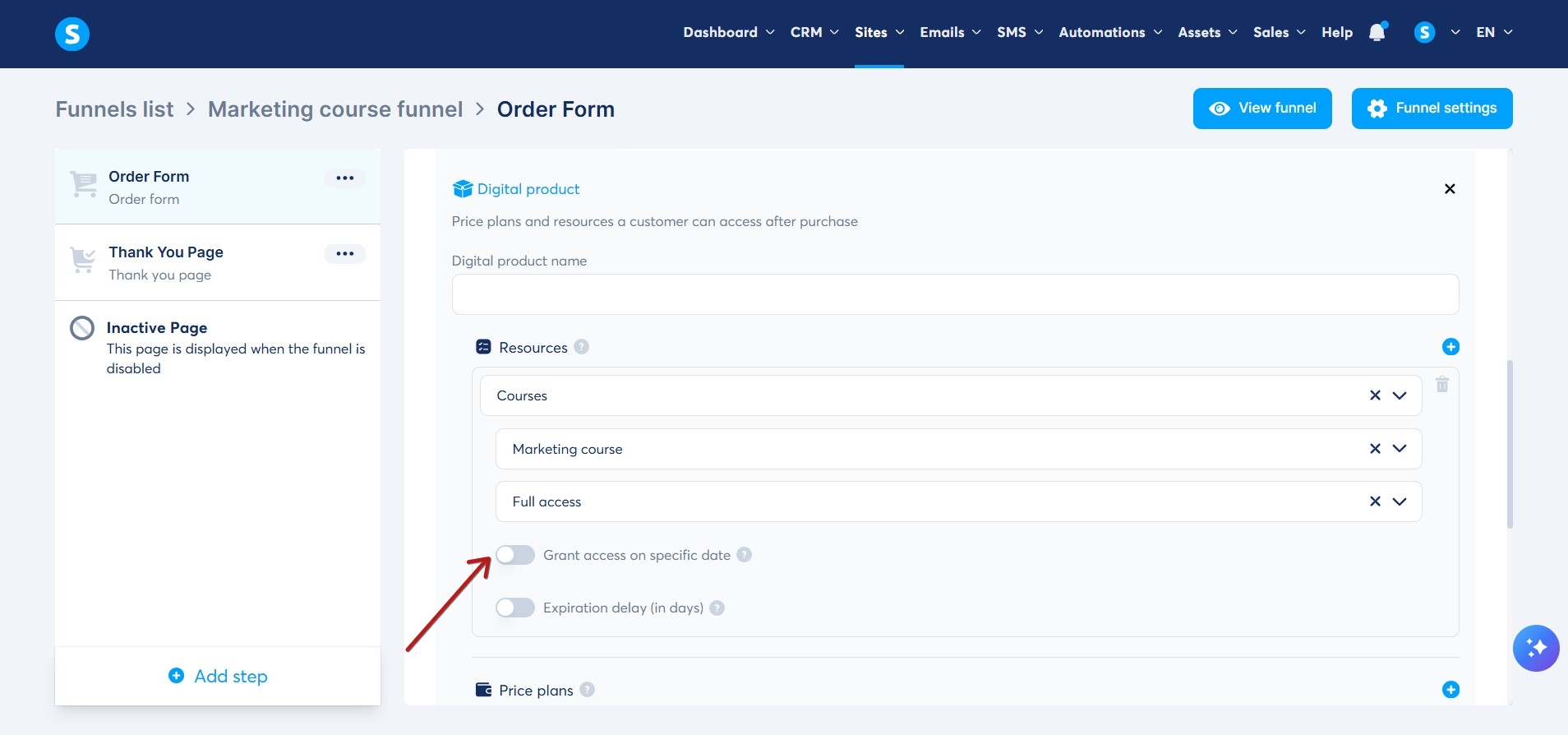 2. Kurslar kaynağını seçin ve seçtiğiniz kursu, müşterilerinize vermek istediğiniz erişim türünü seçin, ardından Belirli bir tarihte erişim izni ver değiştiricisine tıklayarak etkinleştirmeniz gereken bir ayar göreceksiniz.
