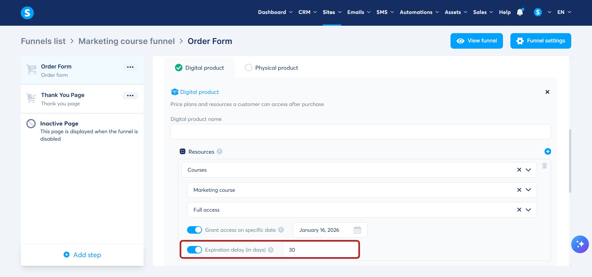 1. Kursunuzu satmak için kullanacağınız satış hunisinin ödeme sayfasına gidin, Dijital ürün teklif türünü seçin (1)