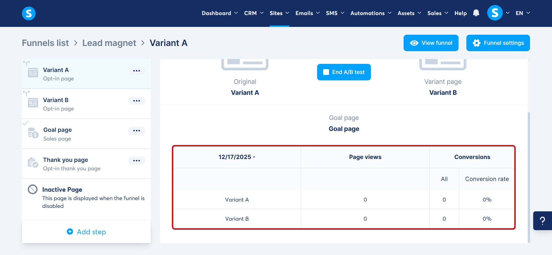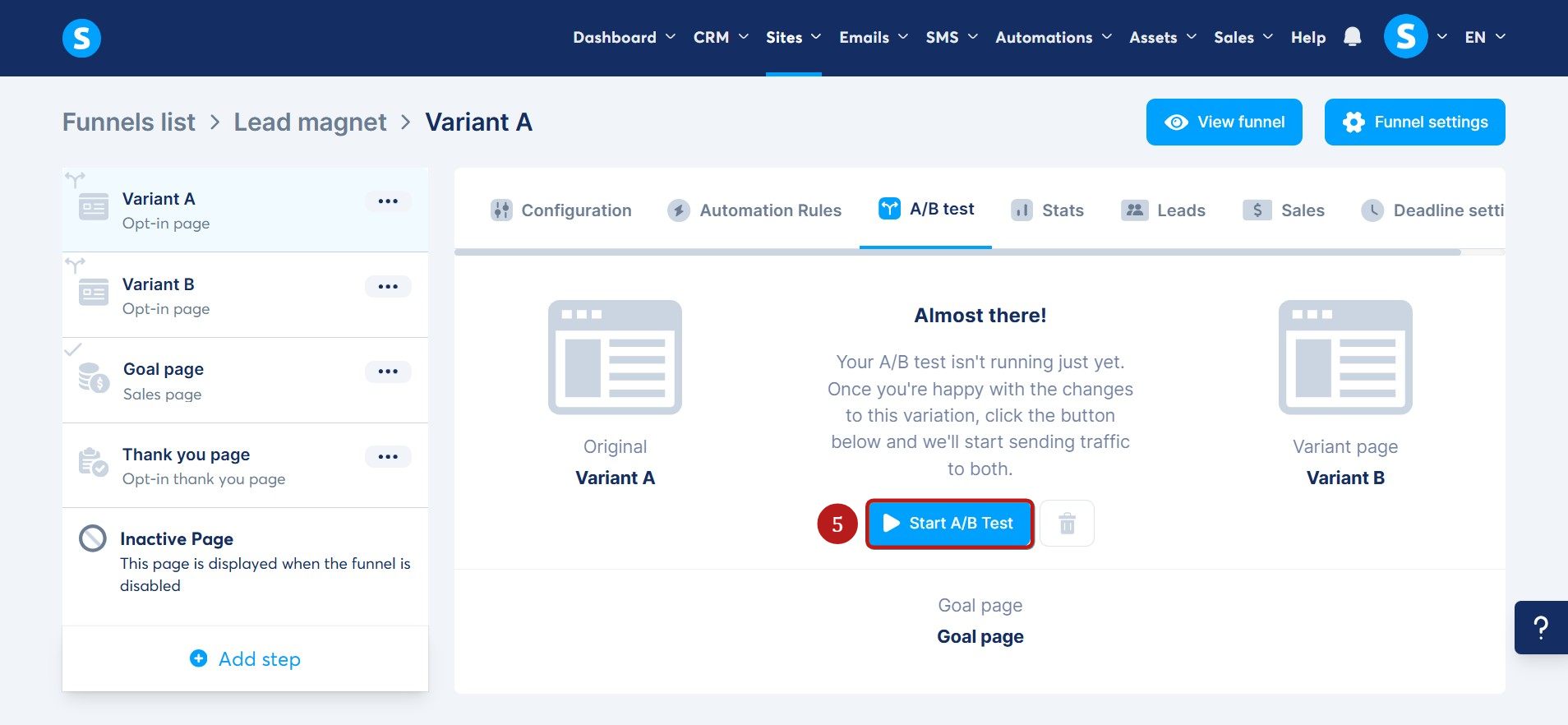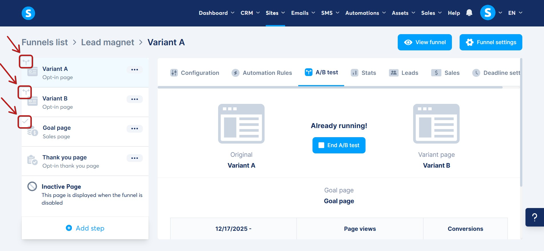 "A Varyantı" ve "B Varyantı" arasında bir A/B testi oluşturmak için her iki sayfanın da satış hunisinde bulunması gerekir.