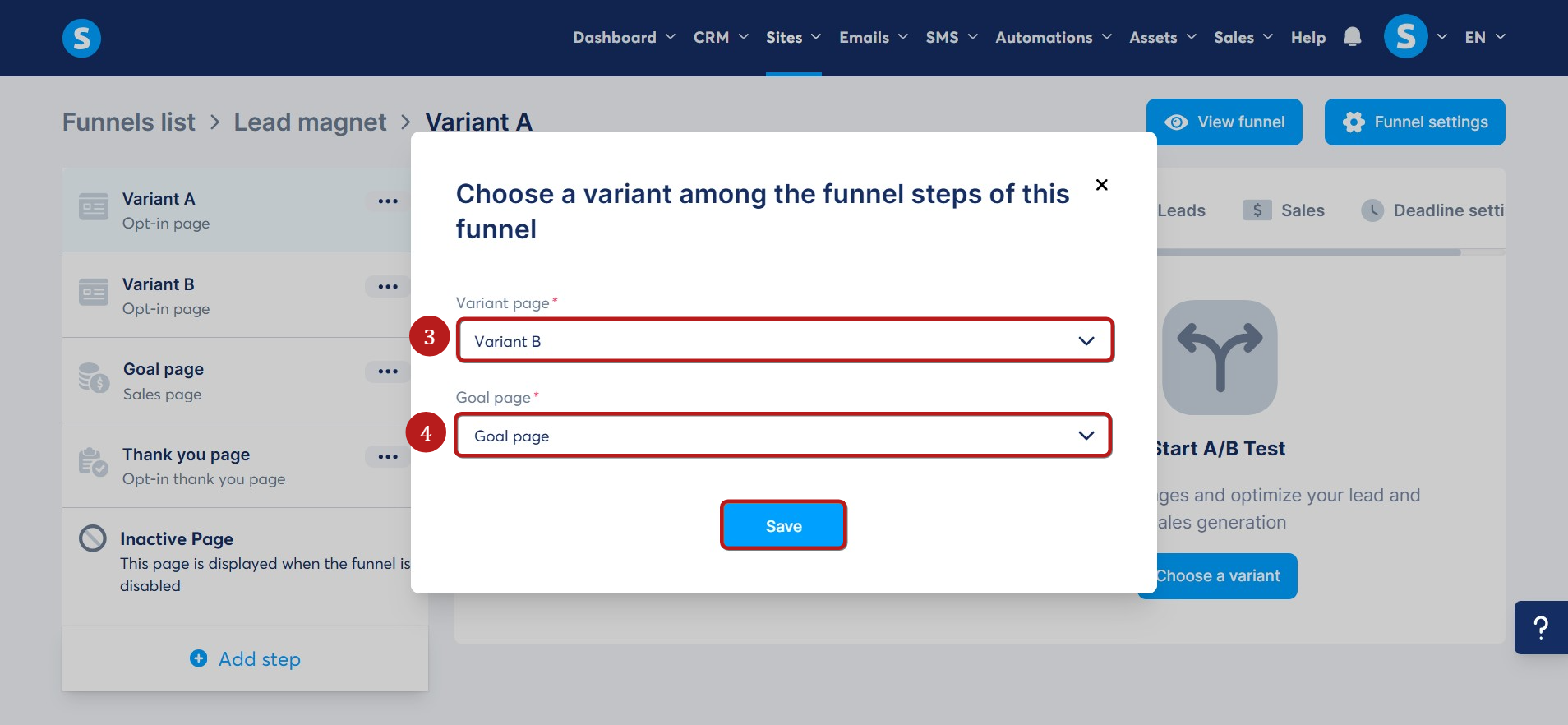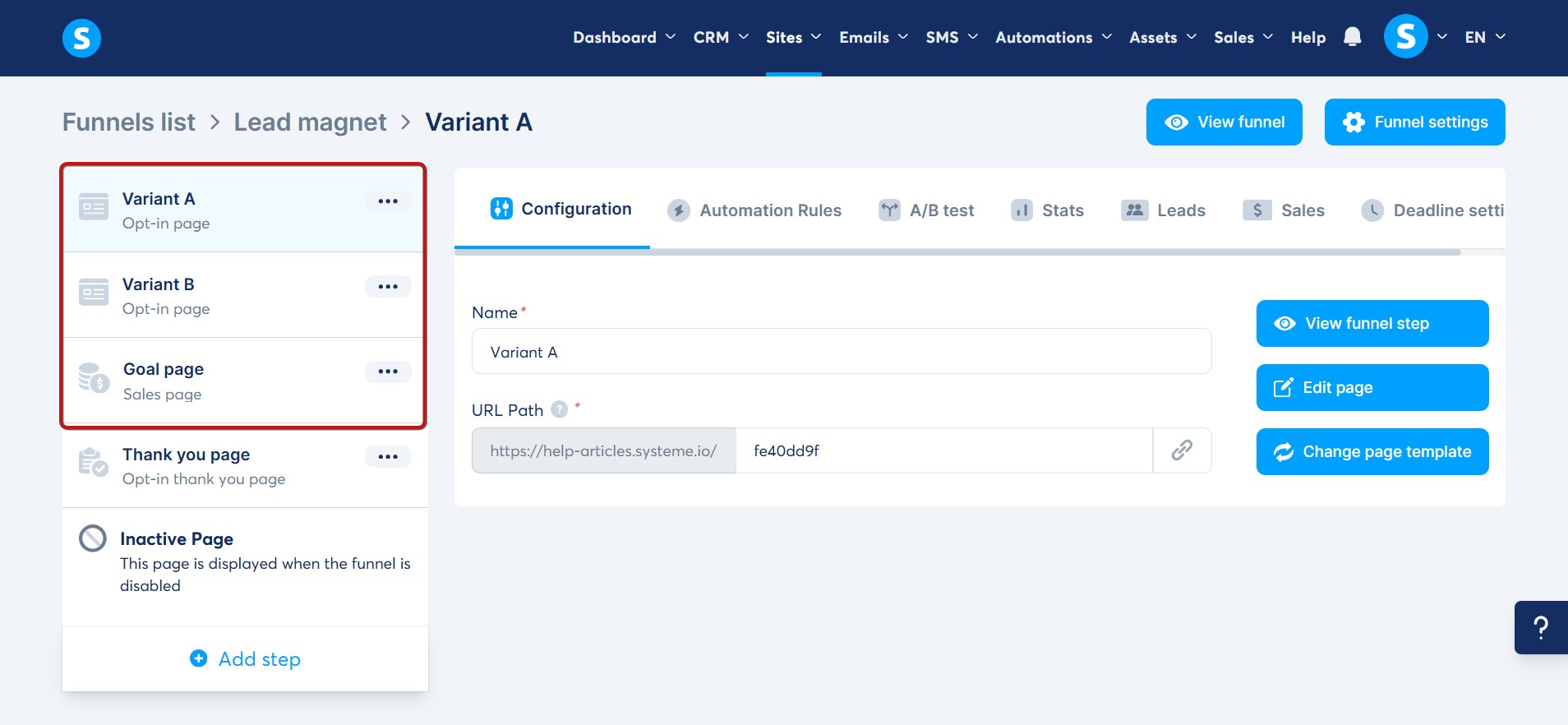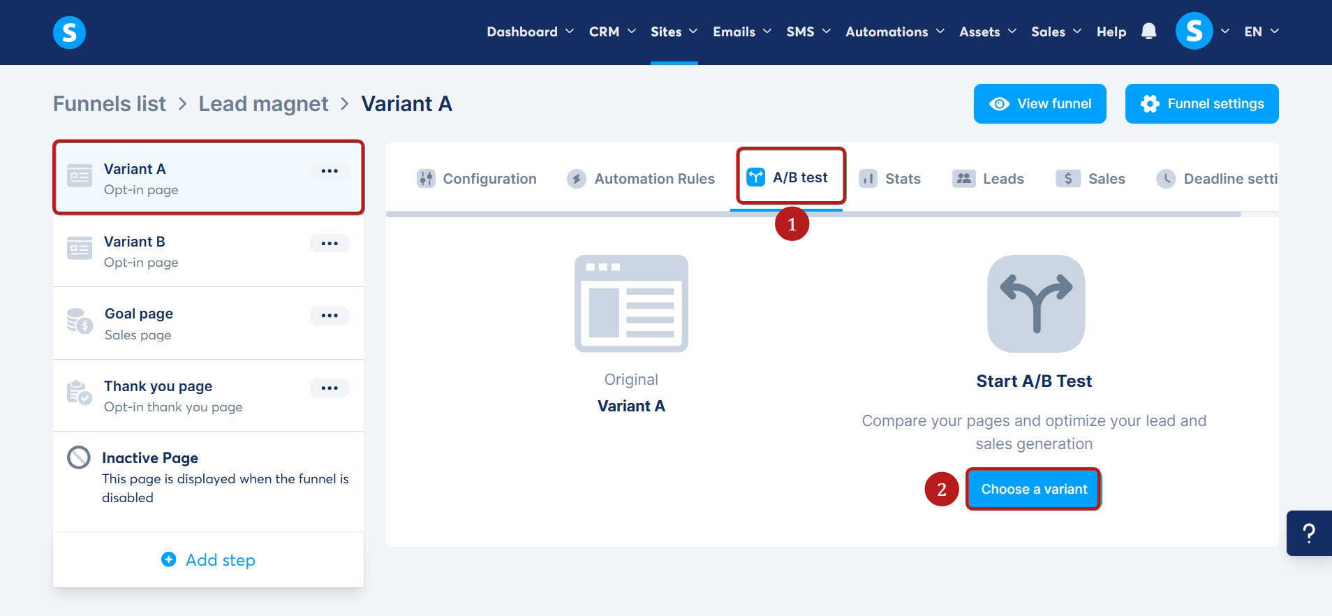 "A Varyantı" ve "B Varyantı" arasında bir A/B testi oluşturmak için her iki sayfanın da satış hunisinde bulunması gerekir.
