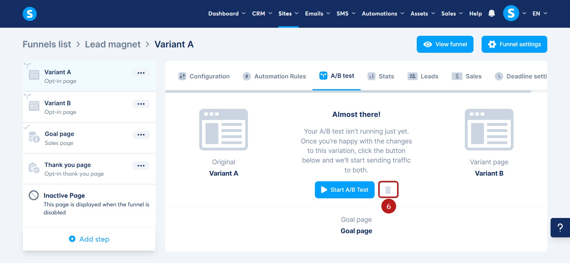 7. Varyantı seçerken bir hata yaparsanız, A/B testini silebilirsiniz (görseldeki 6 numara).
