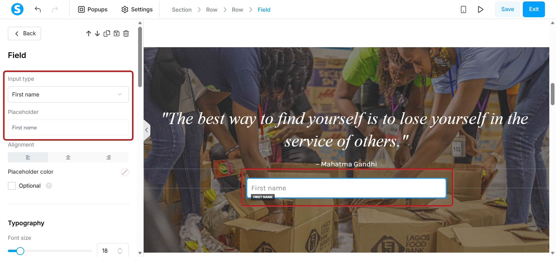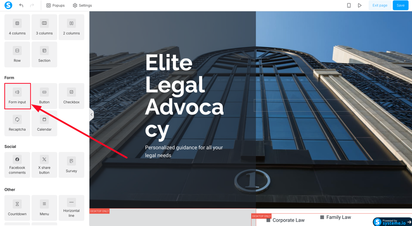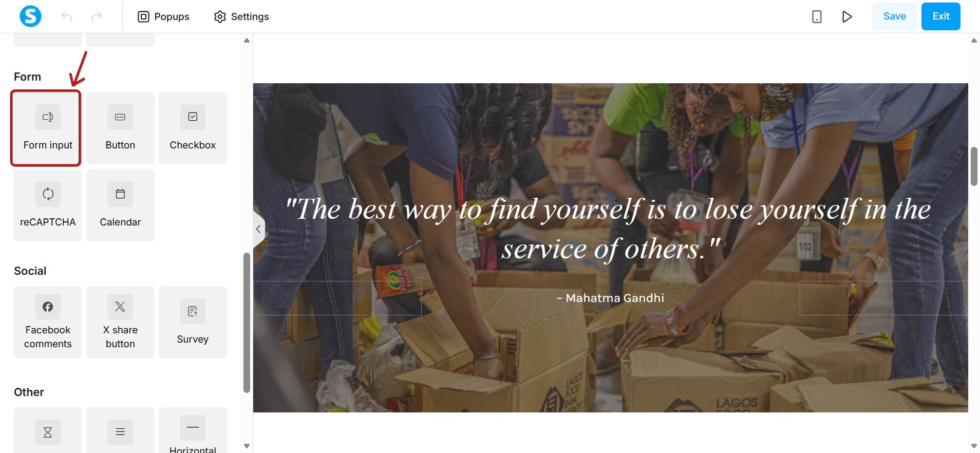 Düzenleyicinin Form bölümündeki mevcut öğeler arasından "Form girişi" öğesini bulun ve sayfanıza sürükleyin: