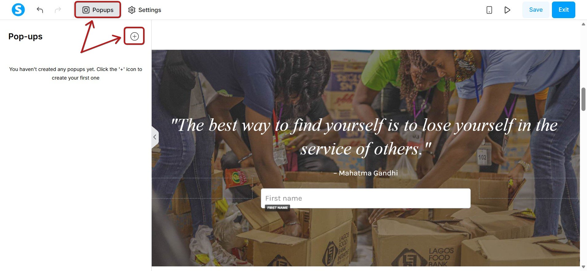 Sıkıştırma sayfanıza bir açılır pencere eklemek için düzenleyiciye erişin ve Açılır pencereler e, ardından Açılır pencere ekle(+) ye tıklayın:
