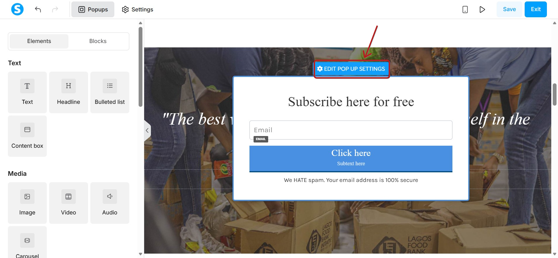 Açılır pencere daha sonra sayfanıza eklenecektir. Düzenlemek için Açılır pencere ayarlarını düzenle düğmesine tıklayın: