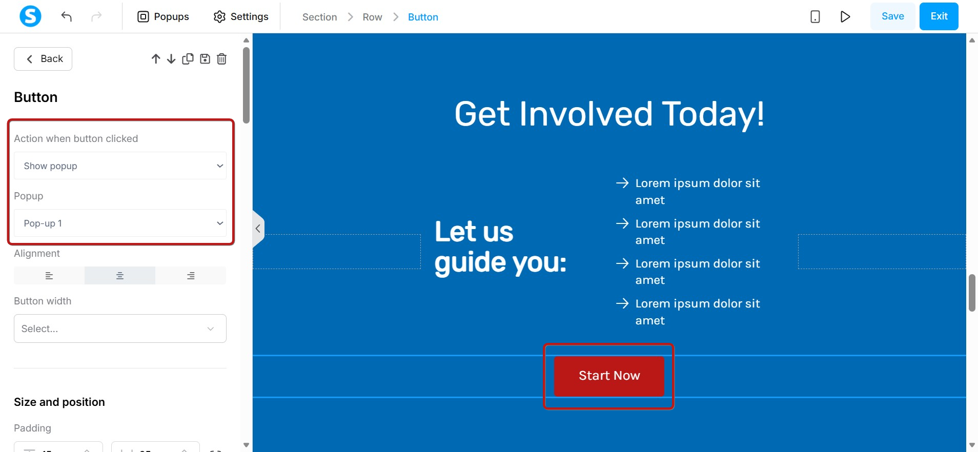 - Düğmeye tıklandığında eylem: "Açılır pencereyi göster"