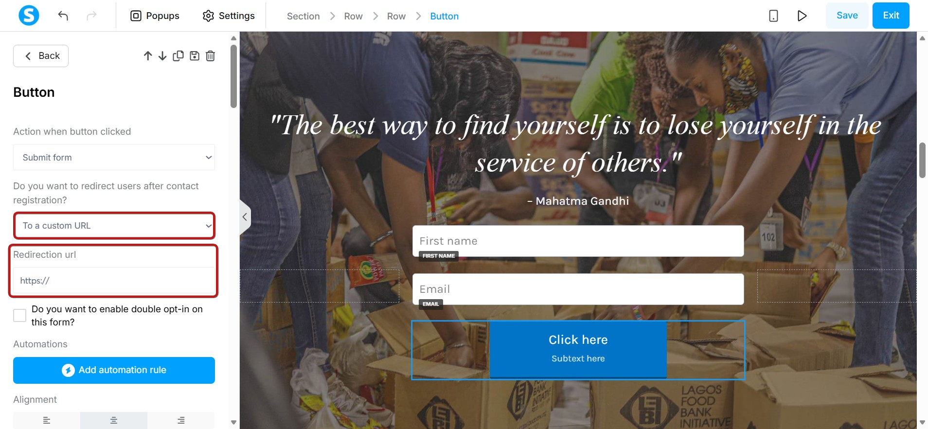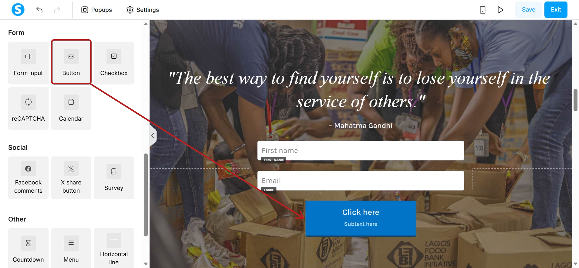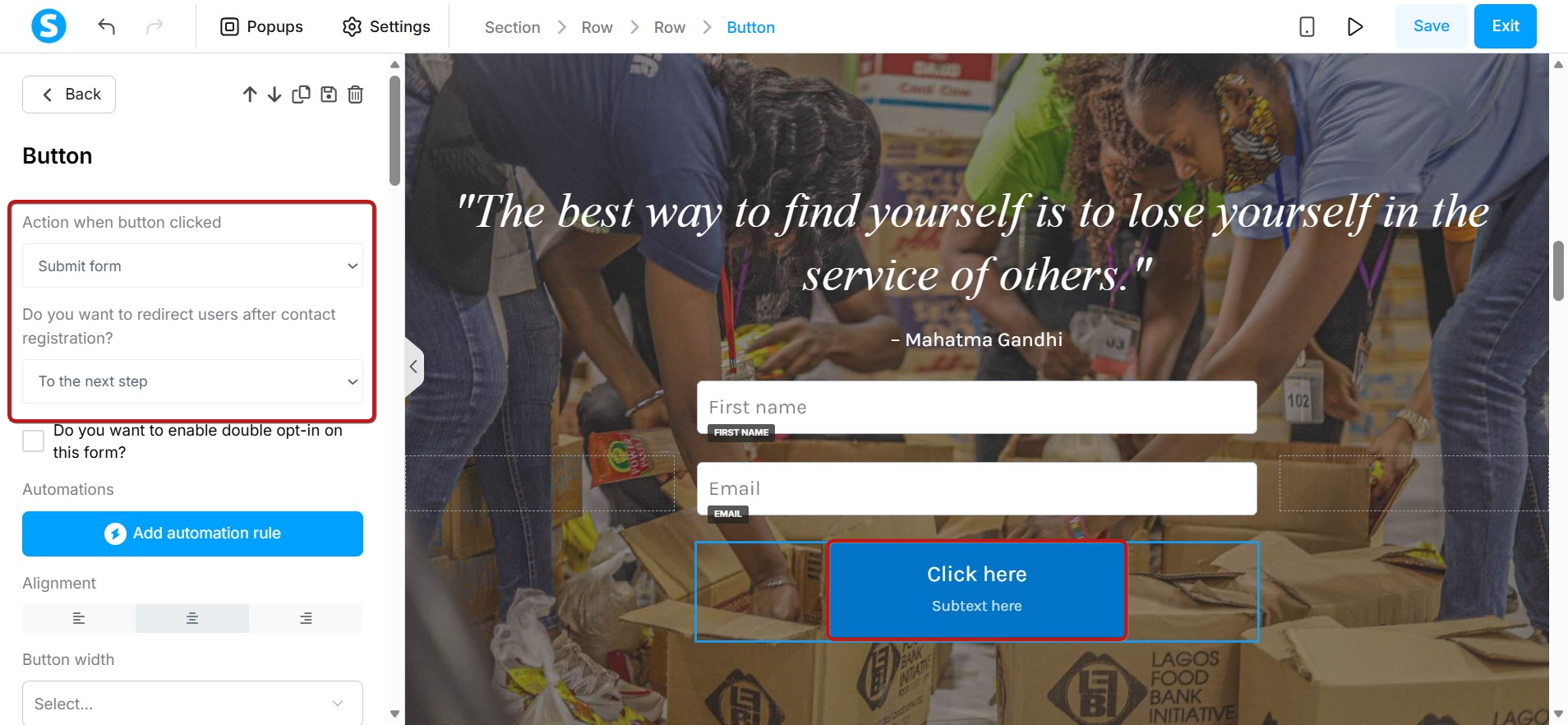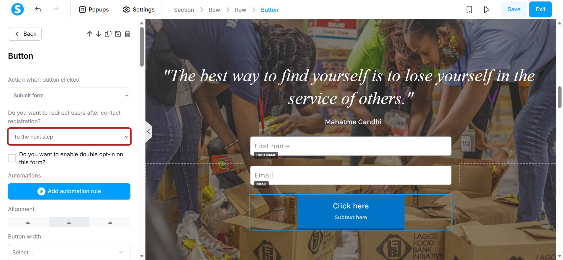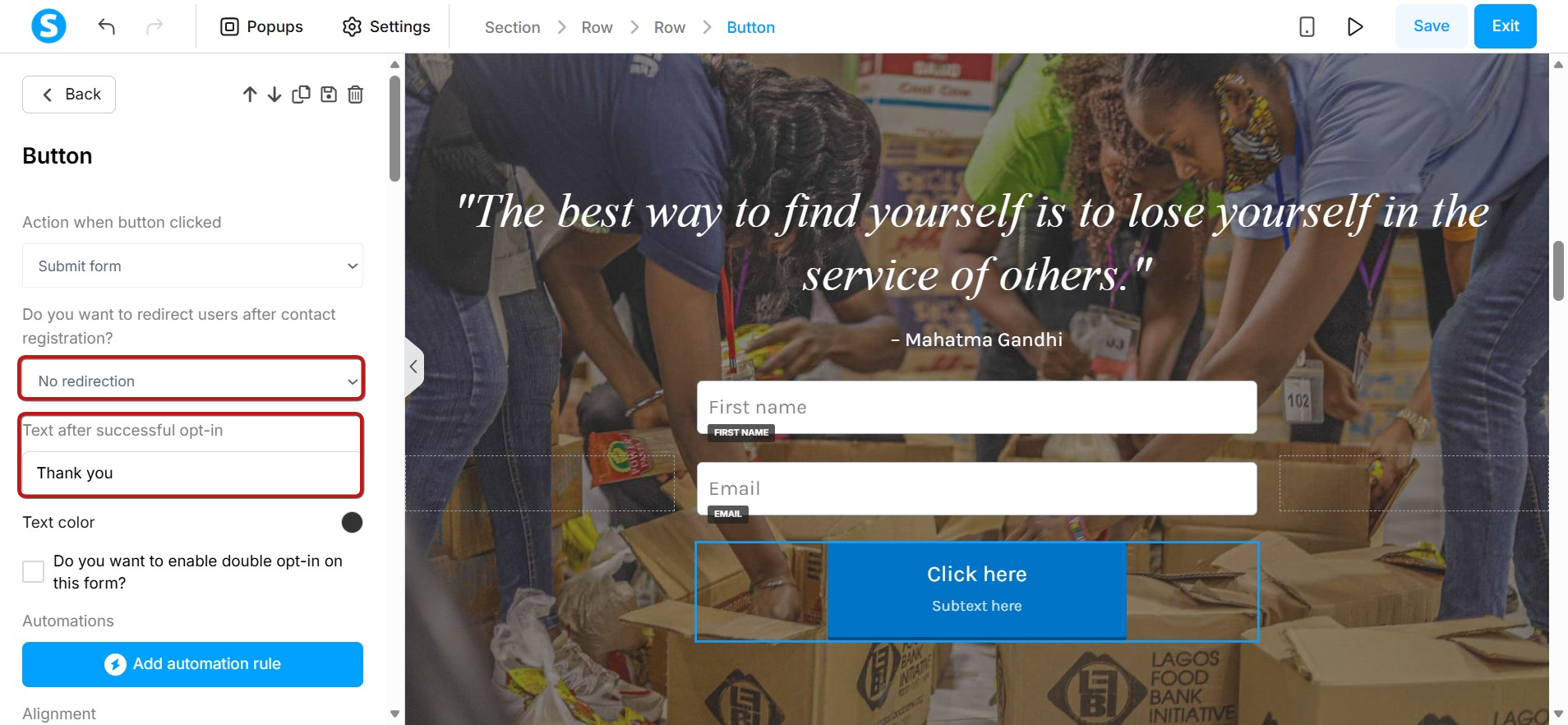 Kişilerinizin e-posta adreslerinin iletişim listenize eklendiğinden emin olmak için, bir sıkıştırma sayfasındaki veya açılır penceredeki formunuzun altına editörden bir Düğme öğesi ekleyin: