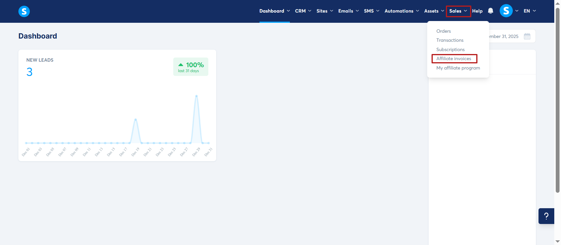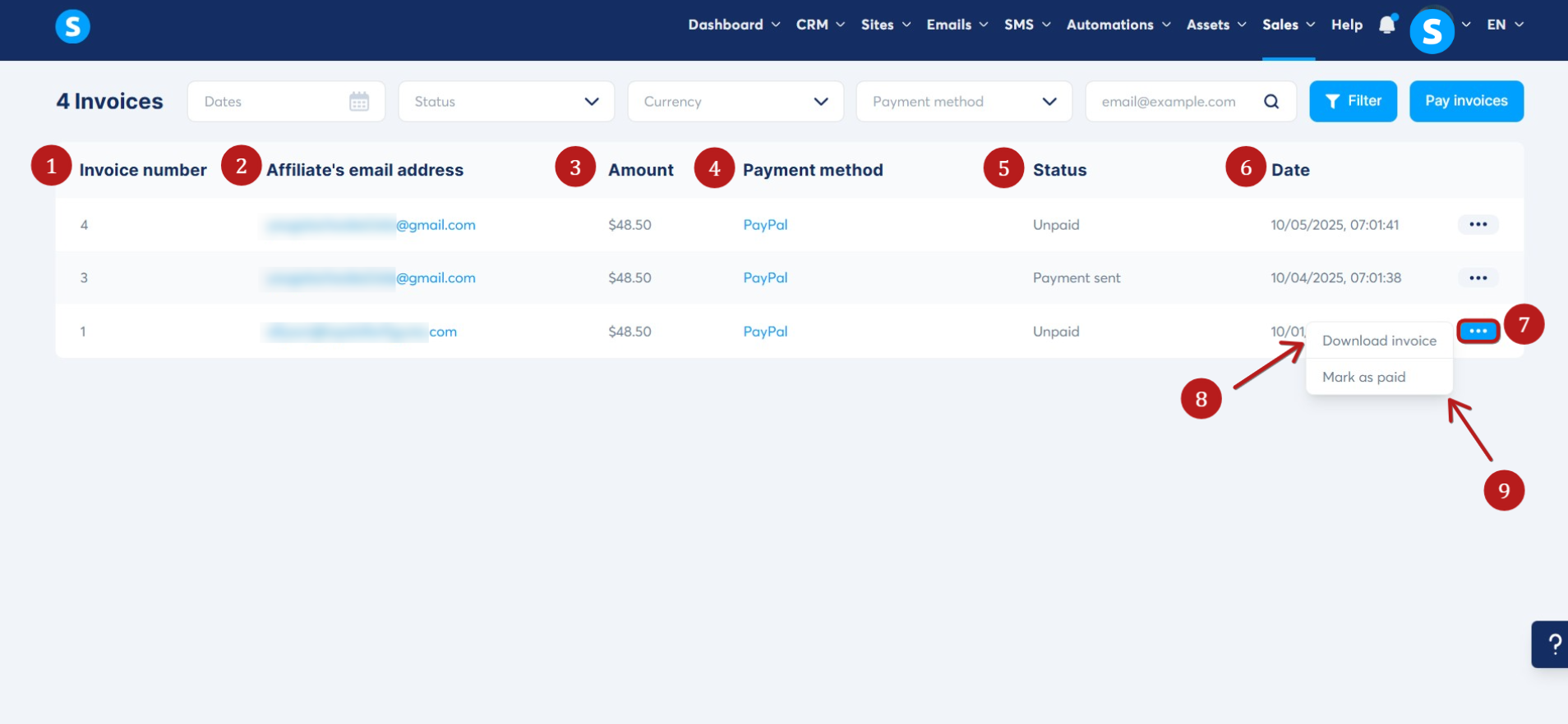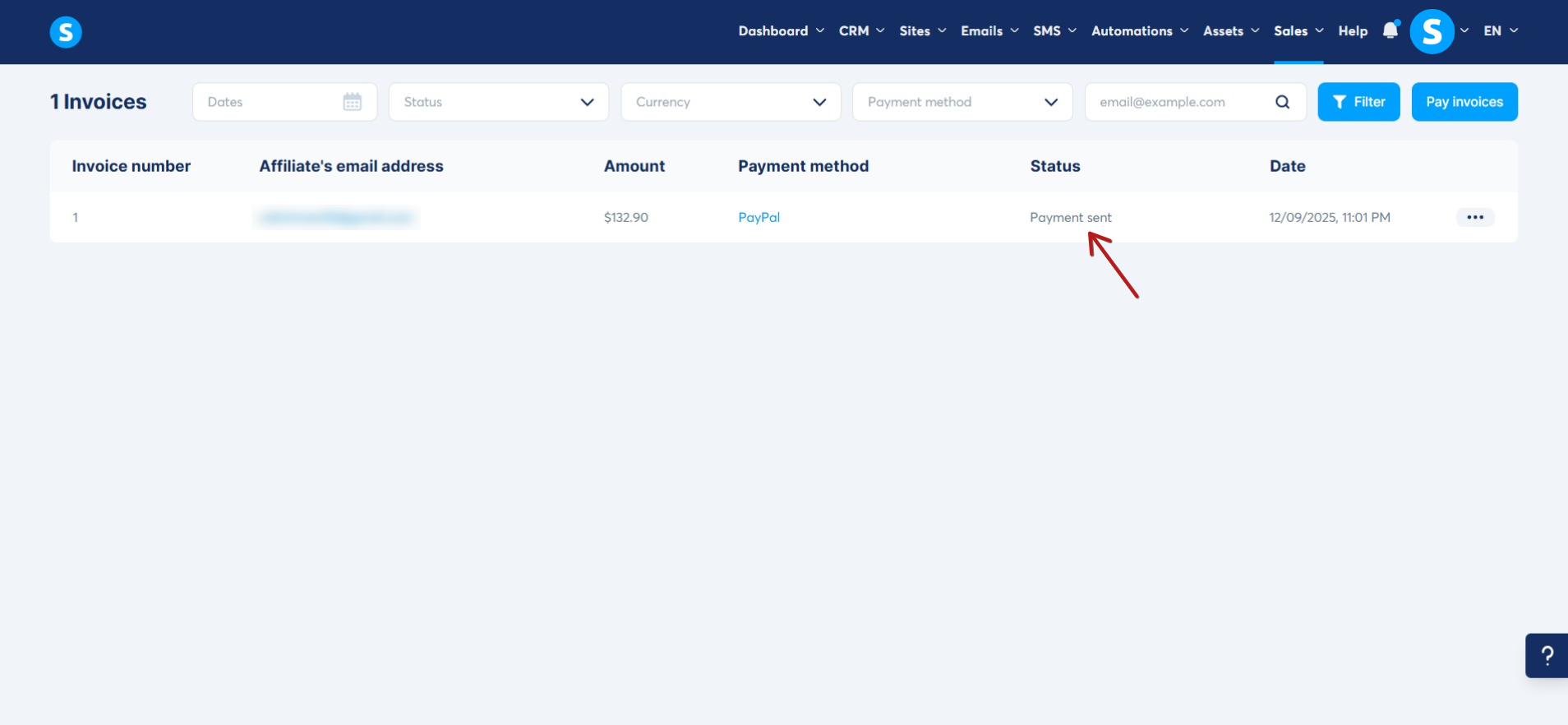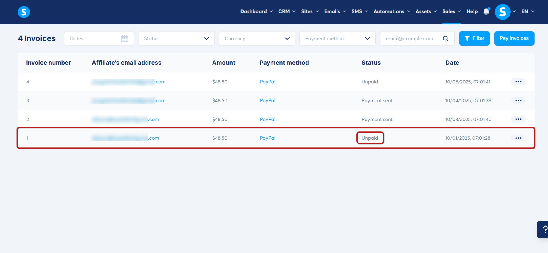Ayın 10'unda oluşturulan faturaları görüntülemek için Menu >> Product/sales >> Affiliate invoices yolunu izleyin
