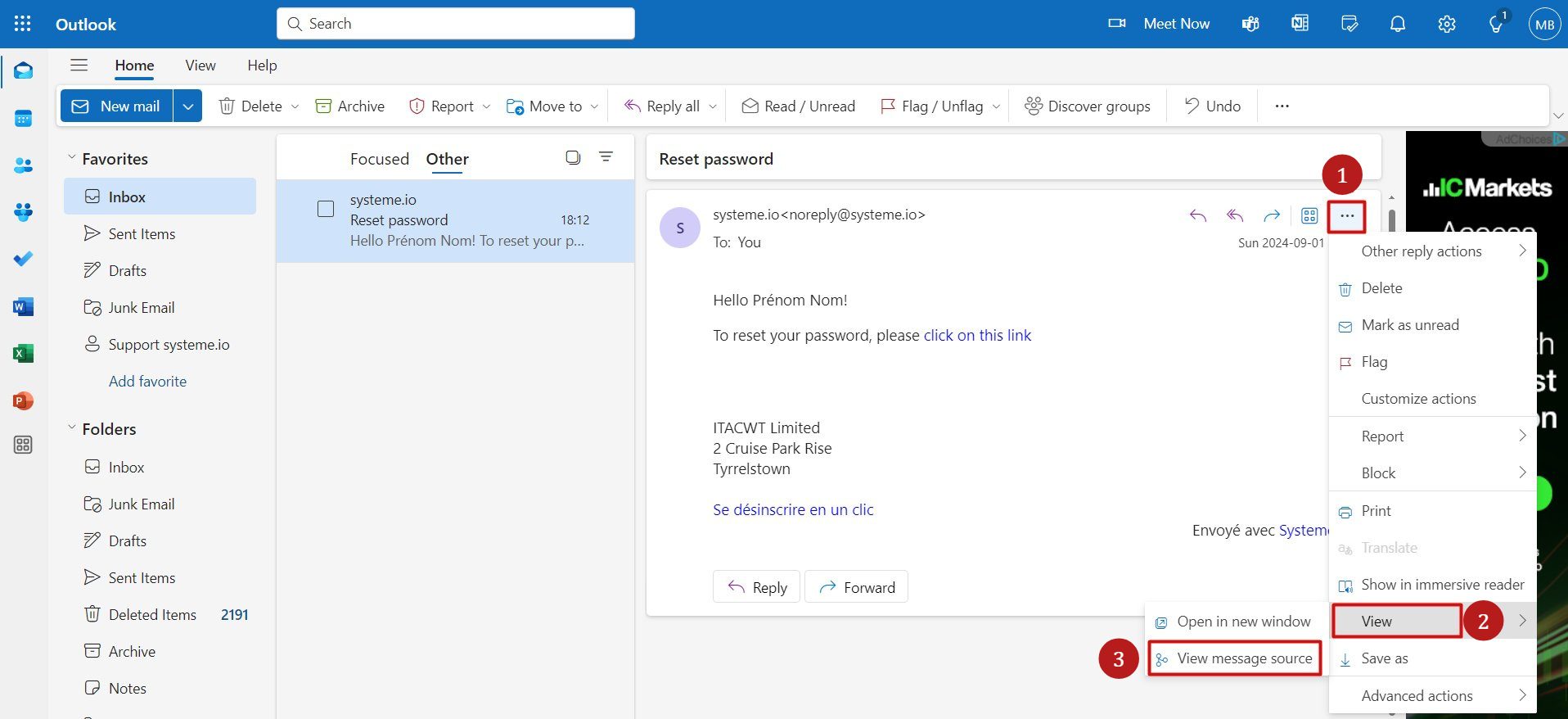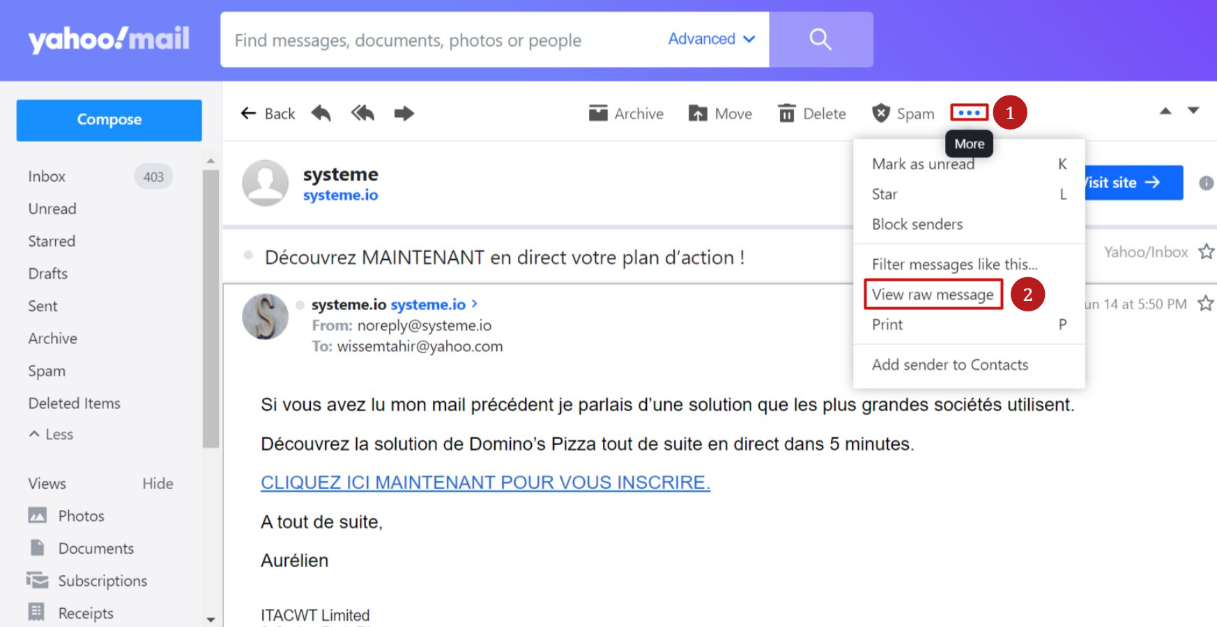 - Menüden View raw Message seçeneğini seçin. (2)