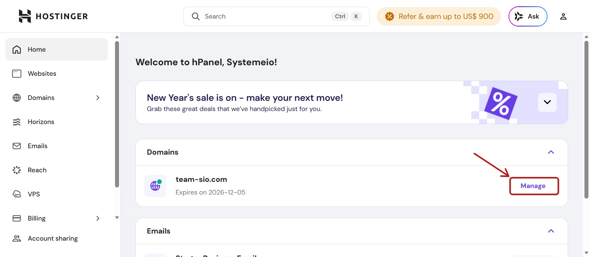 Hostinger hesabınıza giriş yapın, ardından domain'inizin seviyesinde Manage seçeneğine tıklayın.