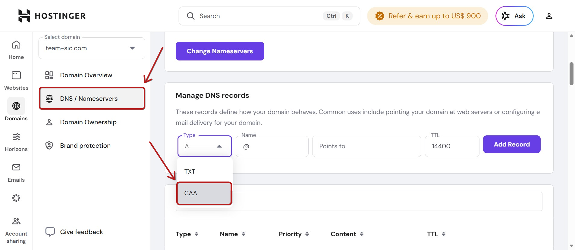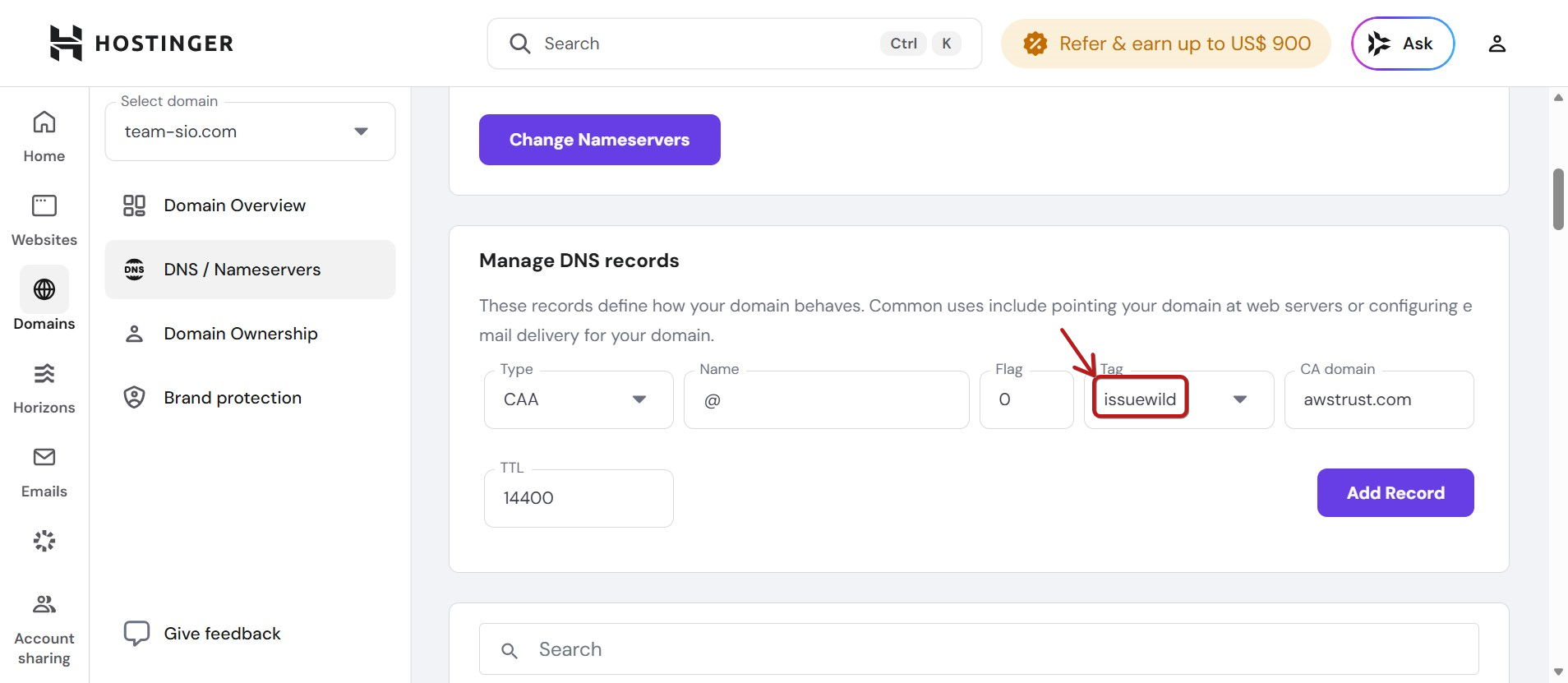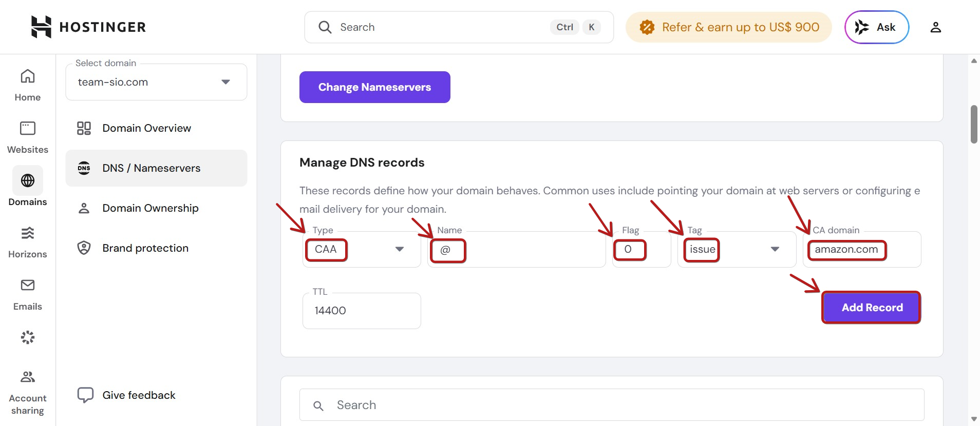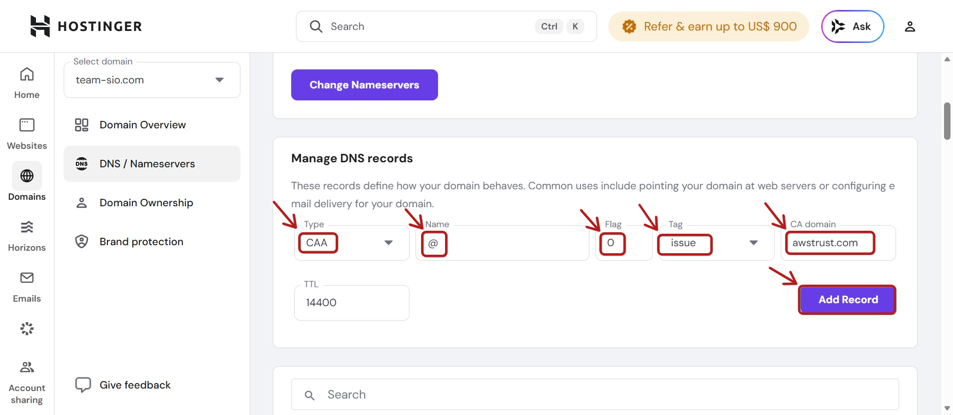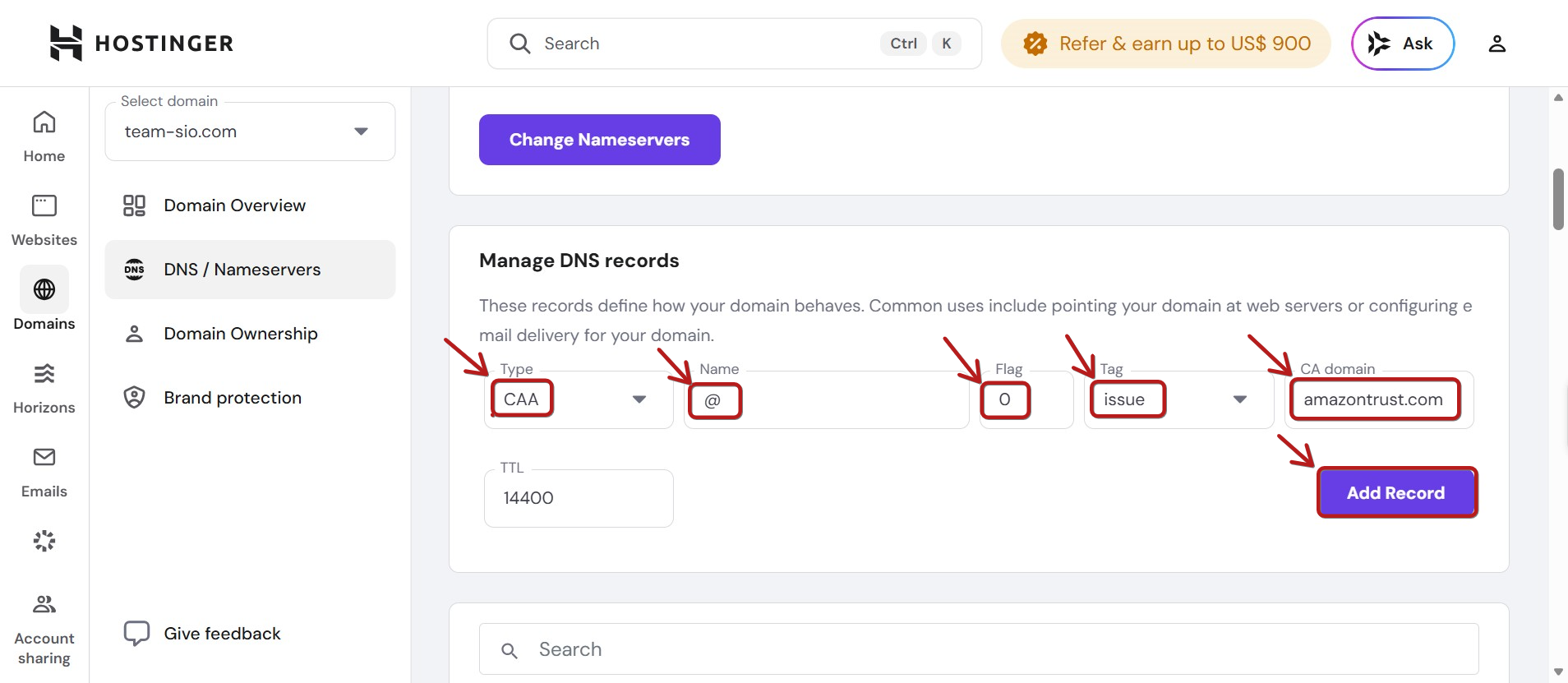 Hostinger'da CAA türü DNS kayıtları ekleme talimatları