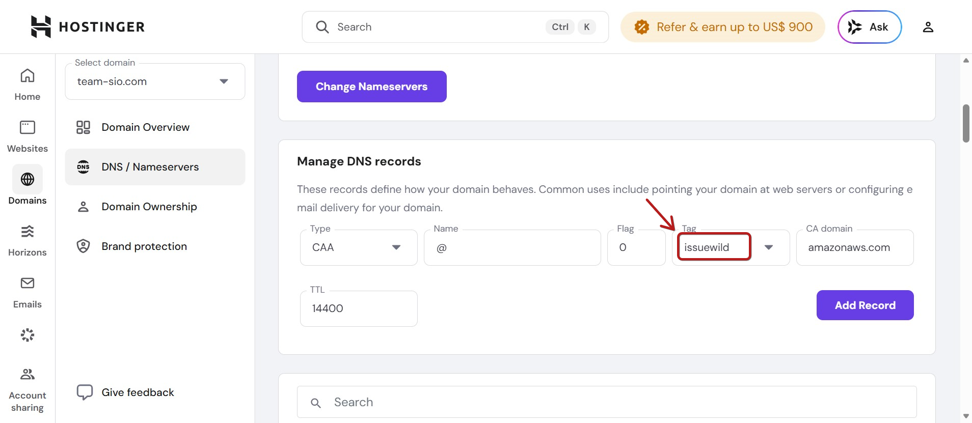 8. CA domain "amazonaws.com" için "Issuewild" kaydı ekleme: