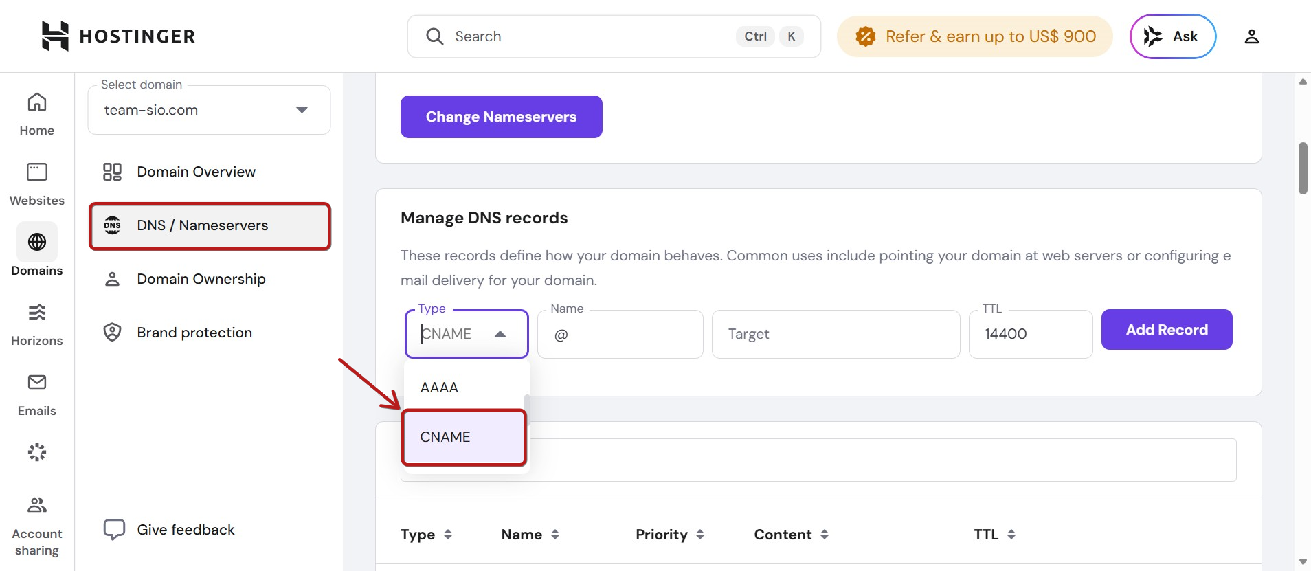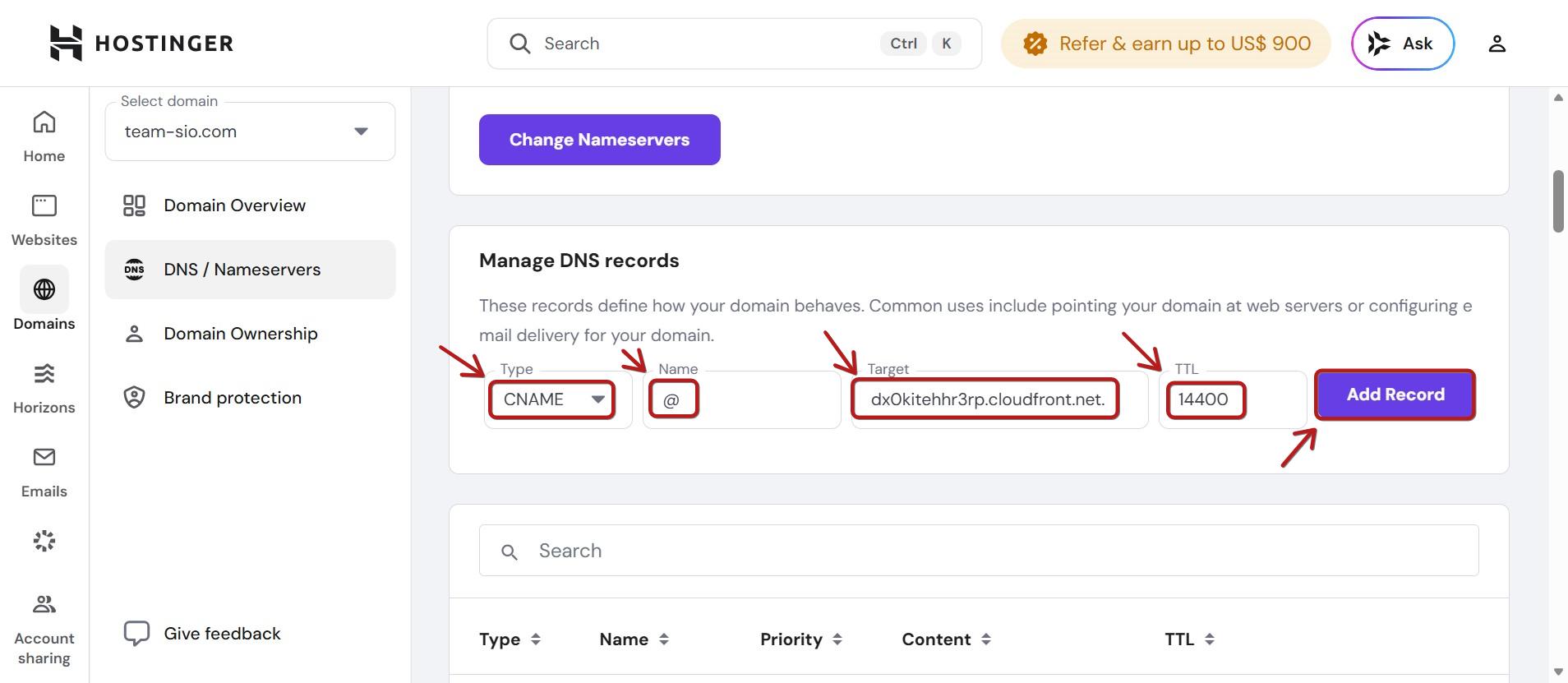 Root domain'i systeme.io'ya ekledikten sonra, Hostinger hesabınızdan DNS ayarlarını görmeniz gerekir