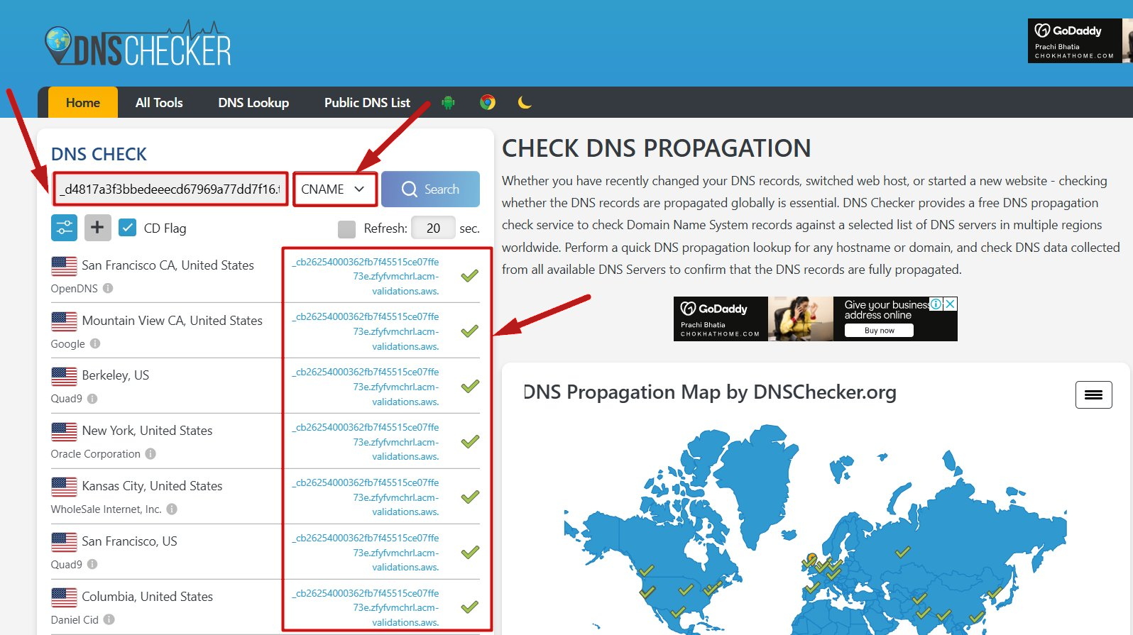 Göstergeler, aşağıdaki örnekte gösterildiği gibi hepsi yeşil olmalıdır. Değilse, girişler doğru yapılmamıştır ve DNS'nizi gözden geçirmeniz gerekir.