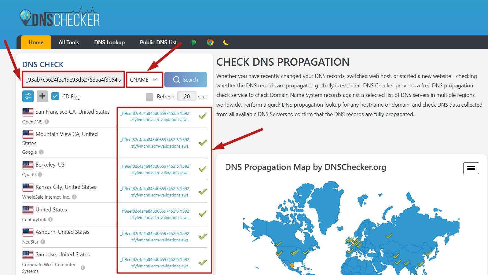 İki CNAME barındırma sağlayıcınıza doğru şekilde eklendikten sonra, işlevselliklerini aşağıdaki sitede kontrol edebilirsiniz: https://dnschecker.org