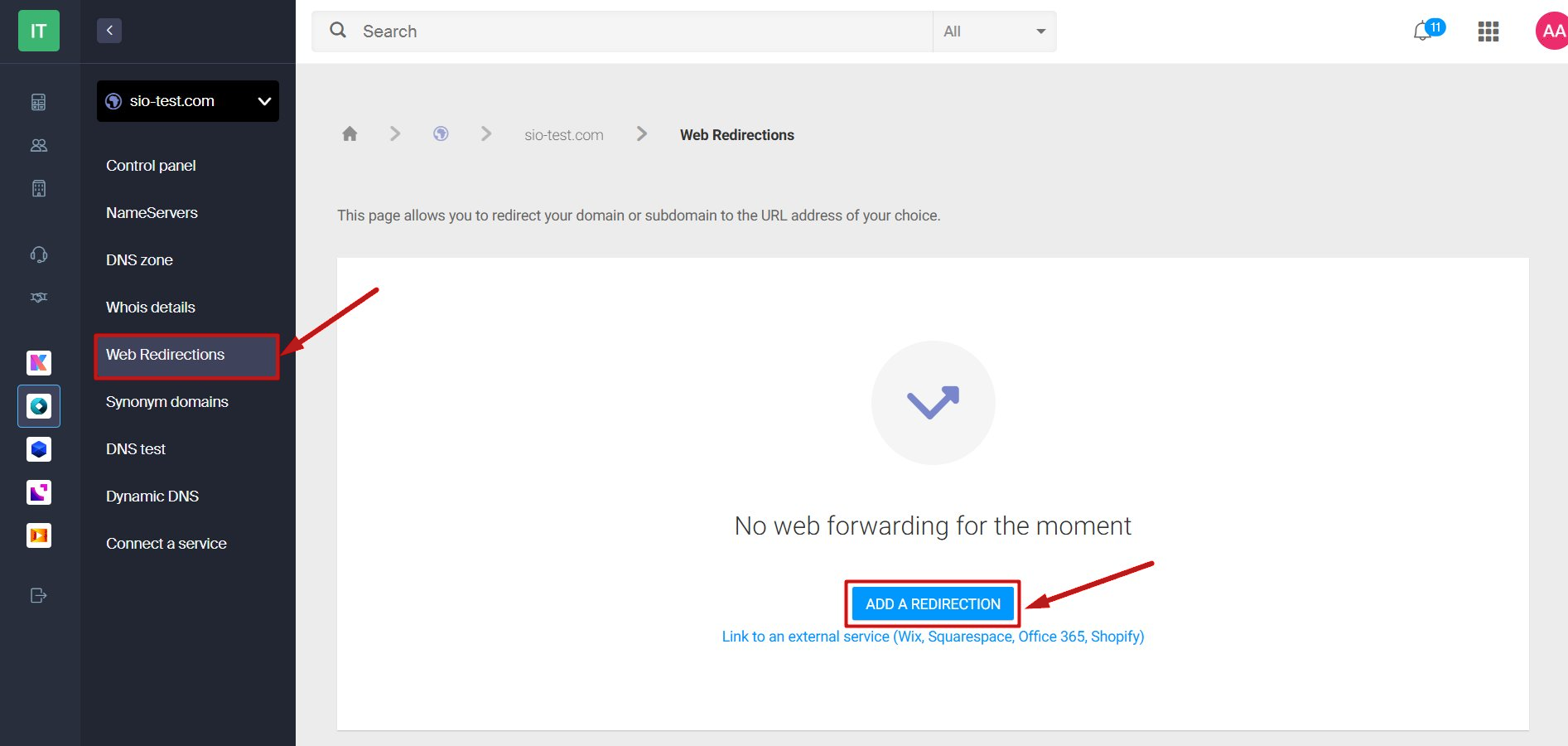 - Domain adınızın DNS bölümüne gidin ve Web Redirections seçeneğine, ardından domain'iniz için Add a redirection seçeneğine tıklayın.