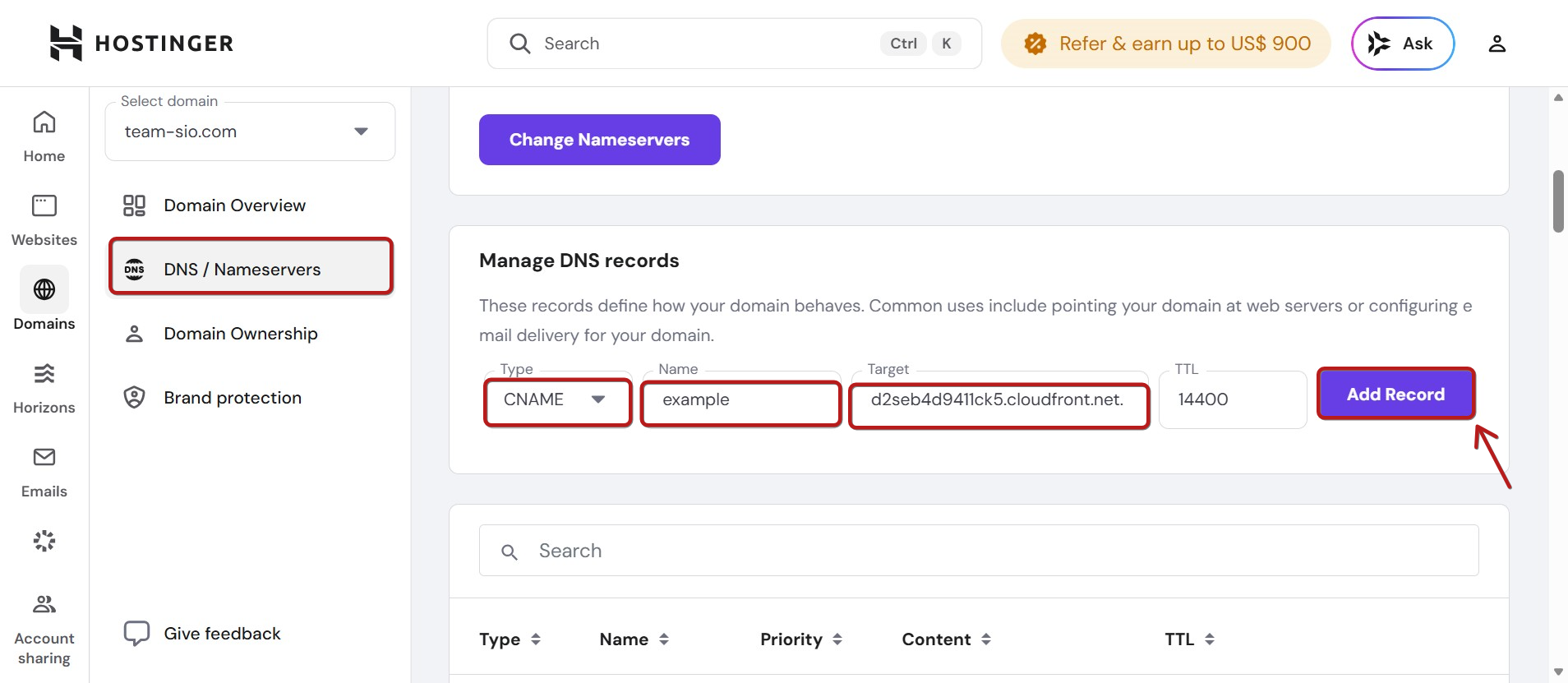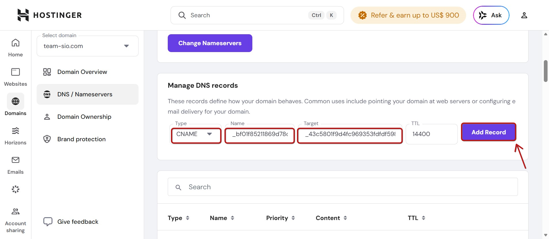 Alt domain'i systeme.io'ya ekledikten sonra, Hostinger hesabınızdaki DNS ayarlarını görmeniz gerekir