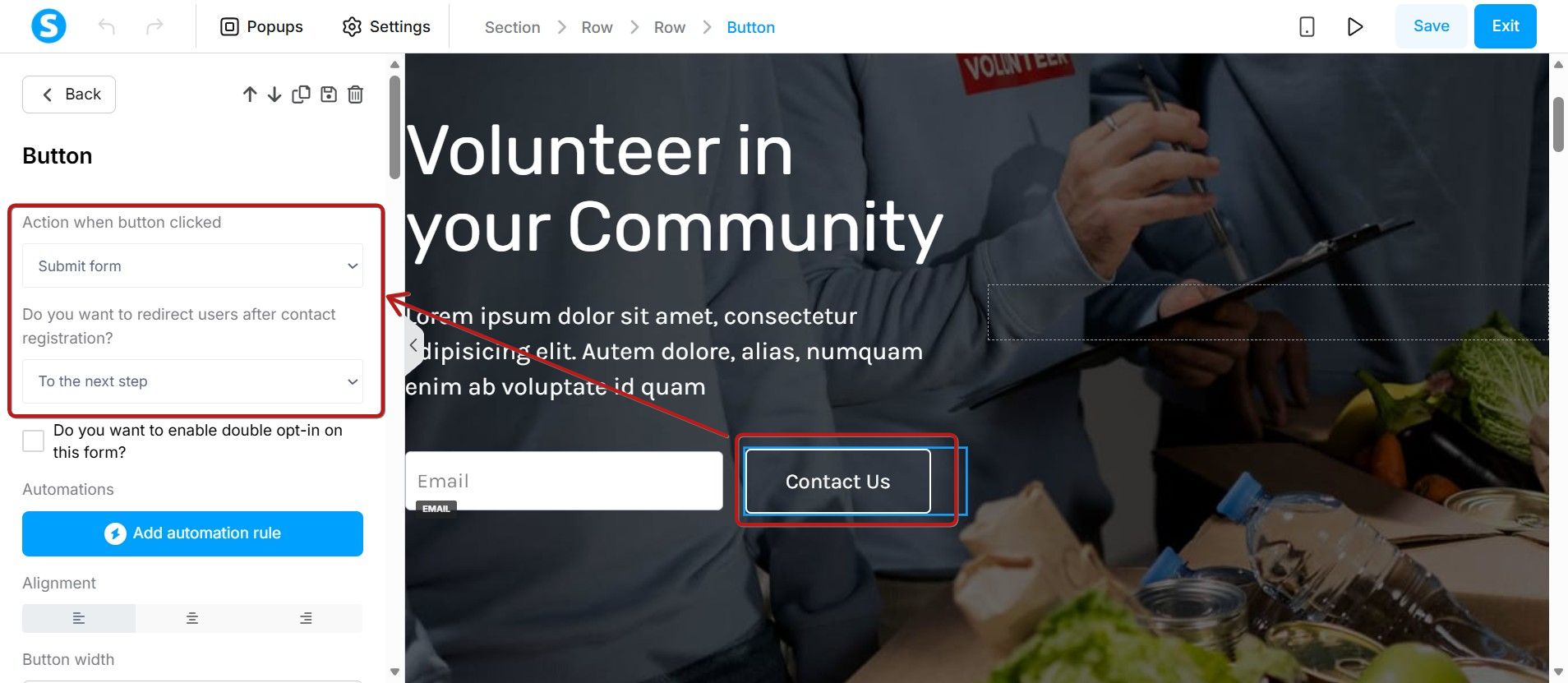 - Düğmeye tıklandığında gerçekleşecek işlem seçeneği için Formu gönder seçeneğini seçin.