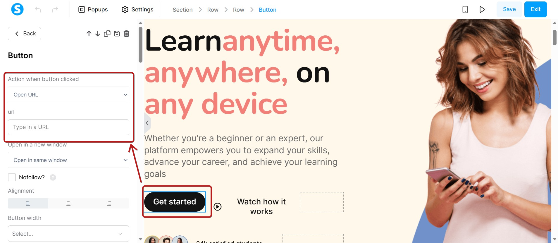 - "Düğmeye tıklandığında gerçekleşecek işlem" için "URL aç" seçeneğini seçin.