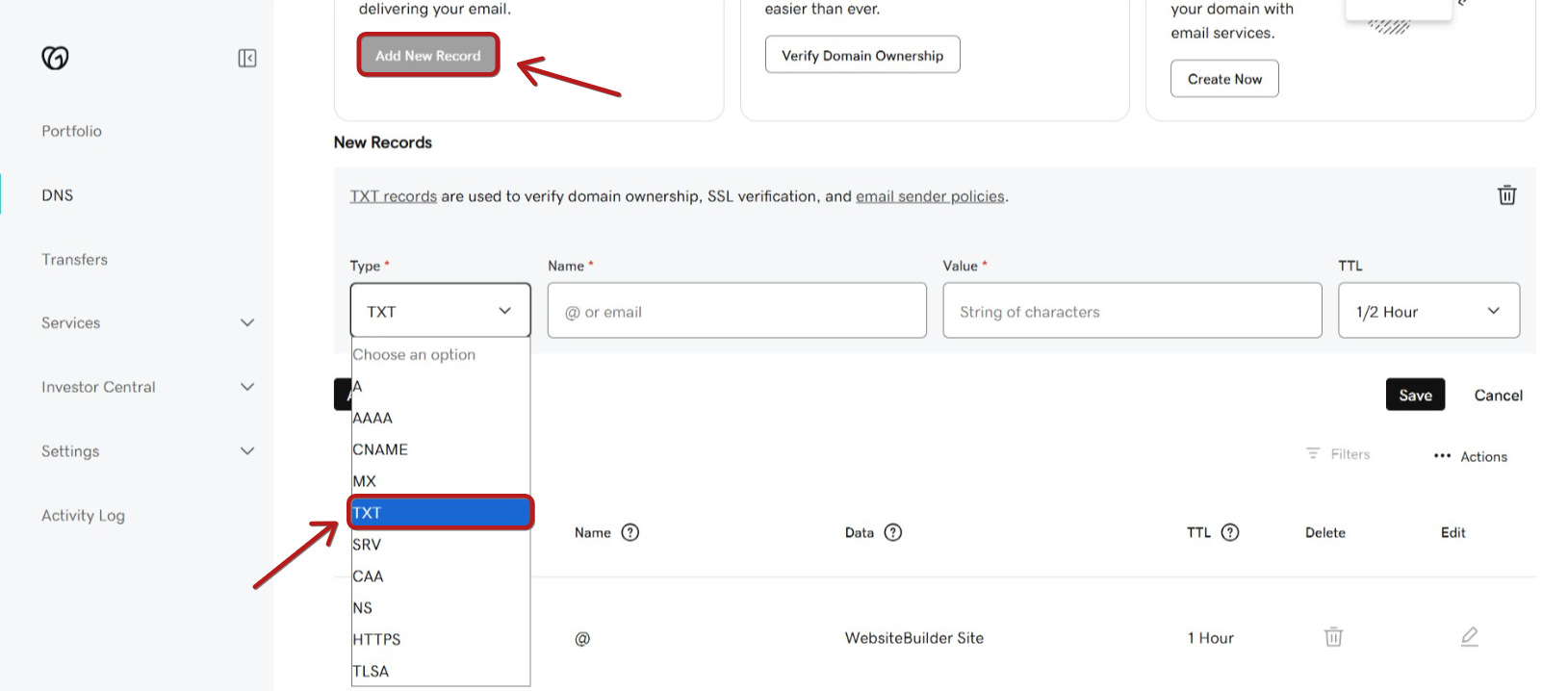 - Bir TXT kaydı oluşturun. Oluşturma işlemi tamamlandıktan sonra, kayıt için bir ana bilgisayar adı ve bir değer girmeniz gerekecektir.