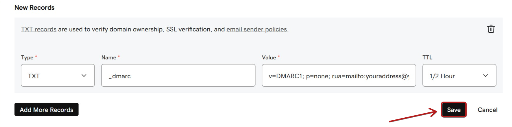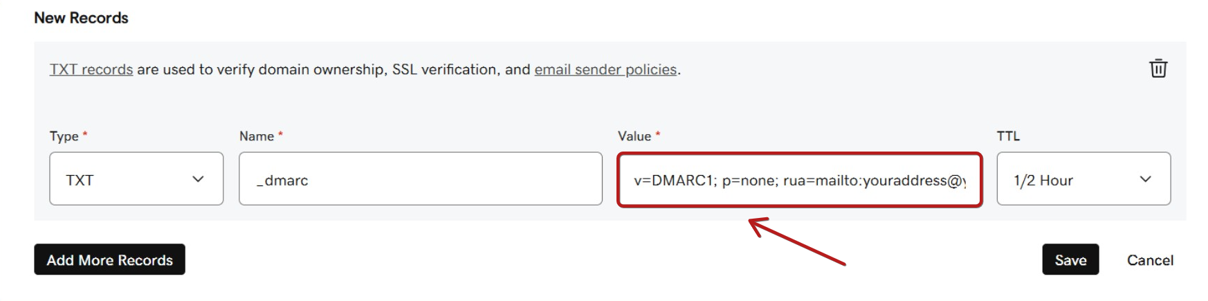 - Kaydınızın değerini girin. İşte DMARC için bir değer örneği: