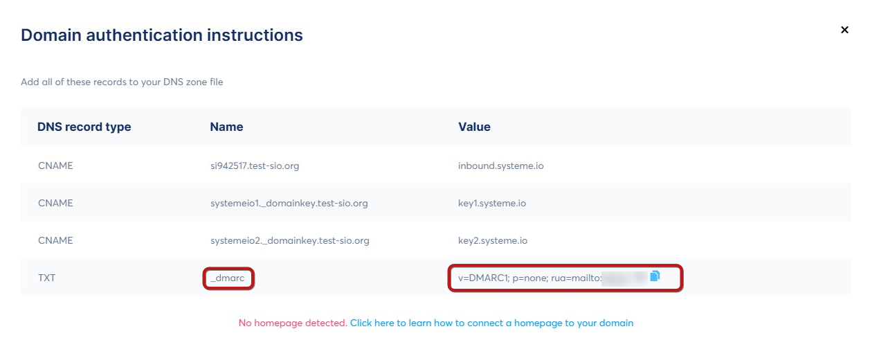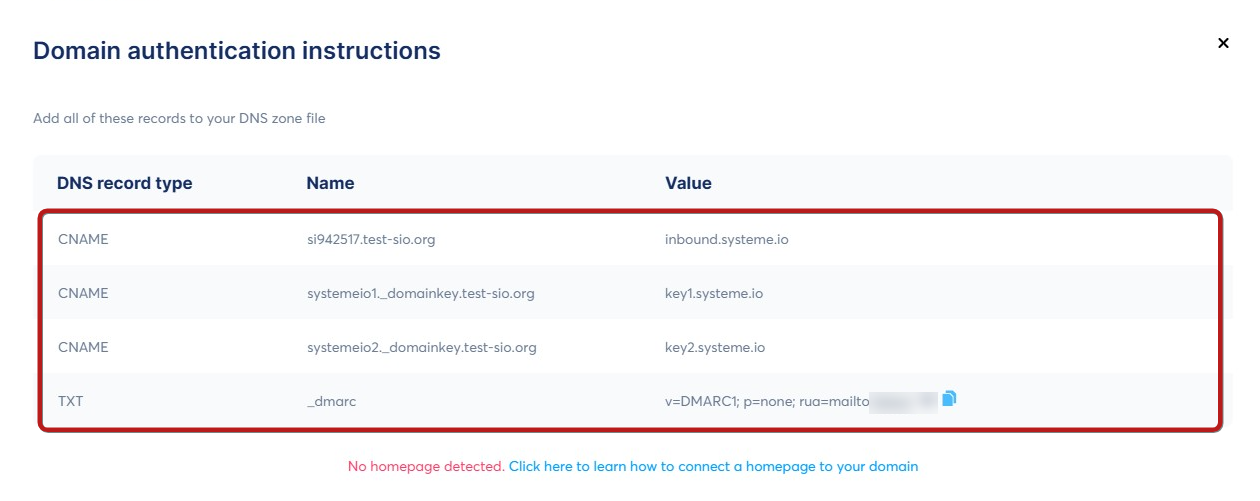 - Oluşturulan TXT kaydını kopyalamak için systeme.io'daki kayıt listesine dönün.