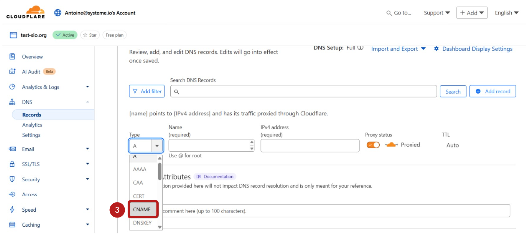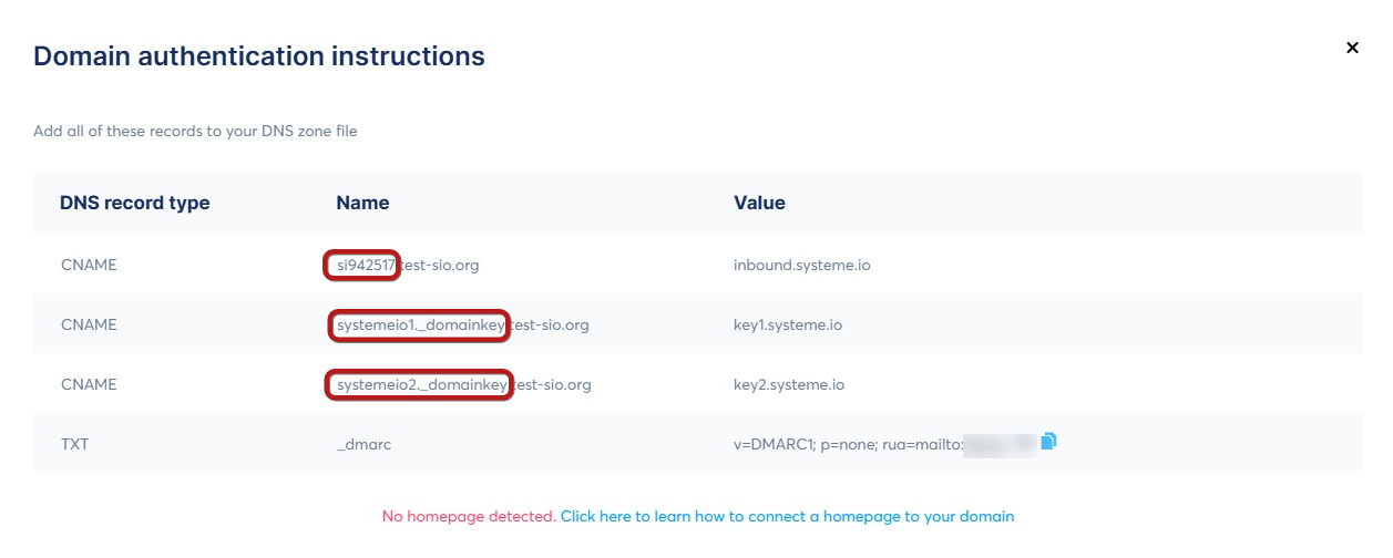 - systeme.io hesabınızda oluşturulan CNAME kayıtlarını (aşağıda gösterilmiştir) kopyalayarak form alanlarını doldurun.