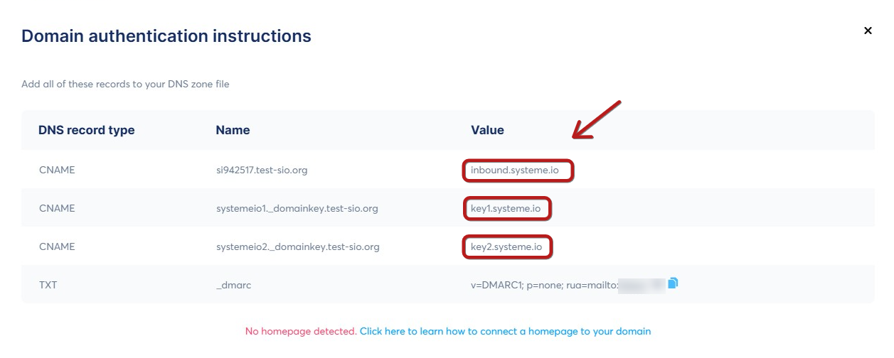 - Sunucunuzun Ad alanına, systeme.io'daki değeri yapıştırın.