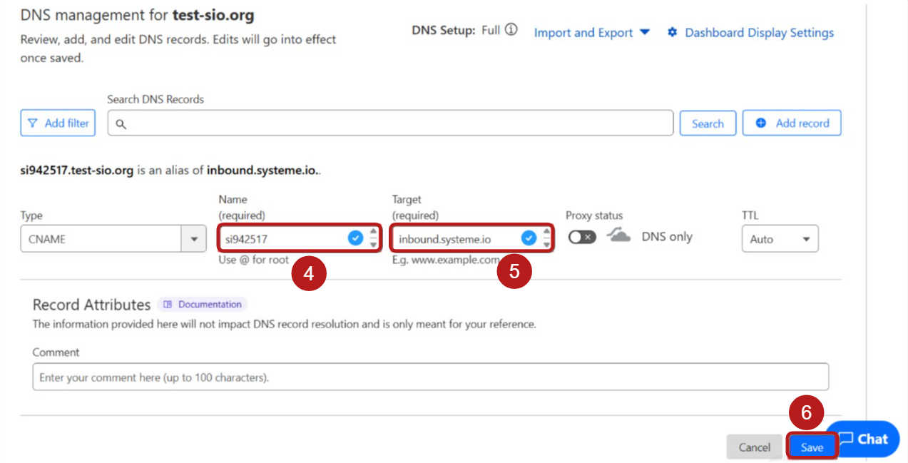 Alan adı girildikten sonra, üç CNAME kaydı + bir TXT kaydı oluşturmak için Kaydet'e (5) tıklayın.