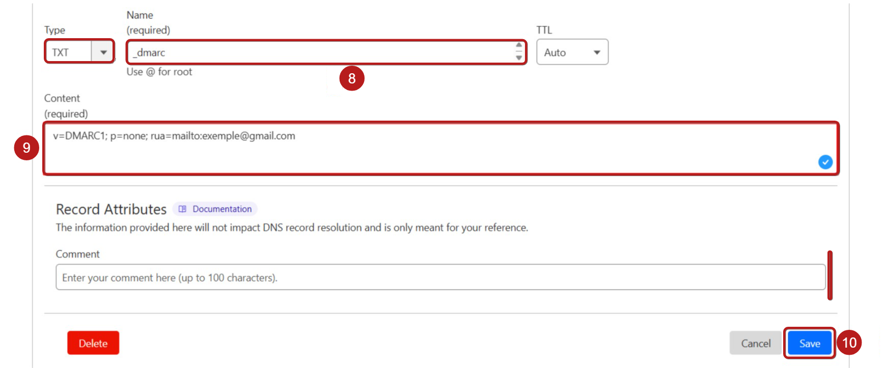 - DMARC kaydını eklemek için TXT seçeneğini seçin (7).