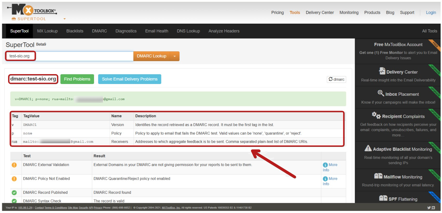 - DMARC kaydınızın bu siteyi kullanarak alan adınızla arama yaparak eklendiğini kontrol edin: DMARC denetleyicisi