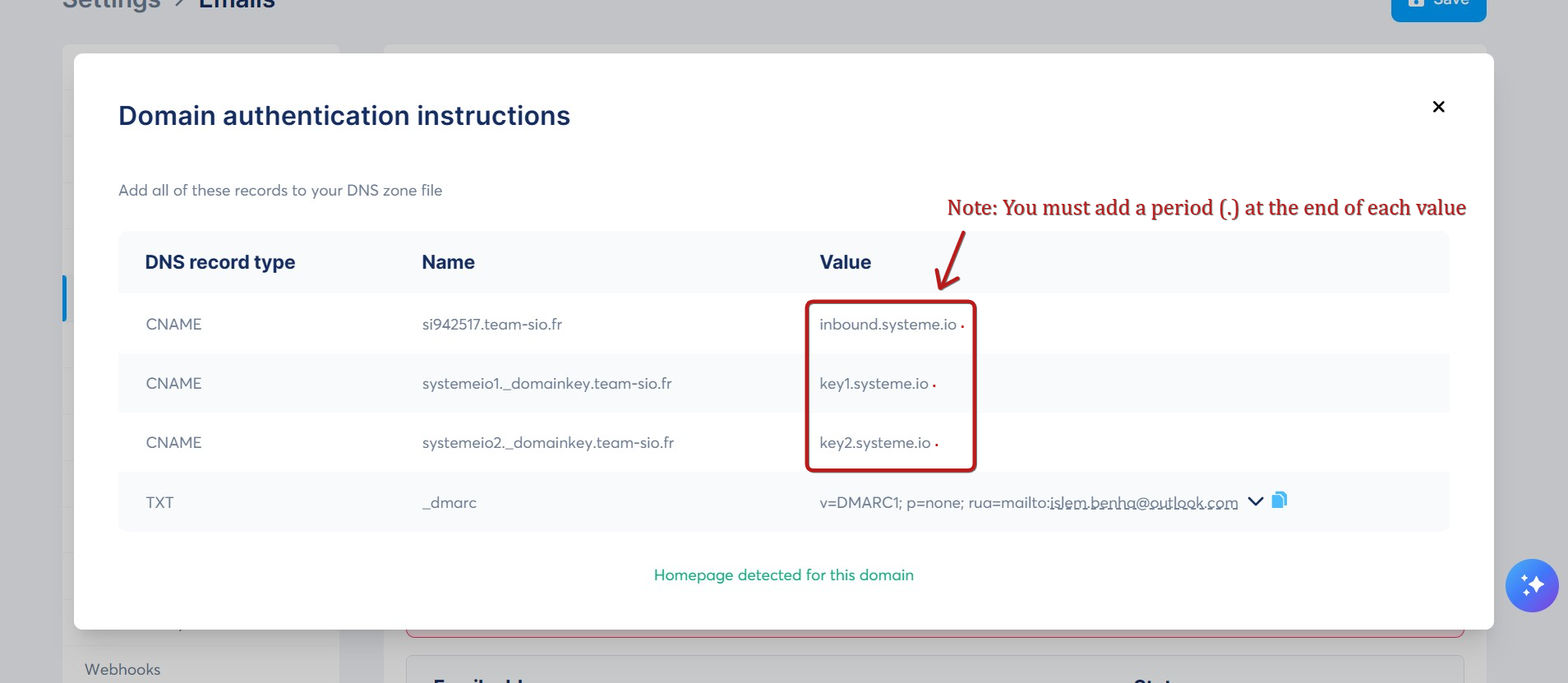 Name: systemeio1._domainkey Value: key1.systeme.io.